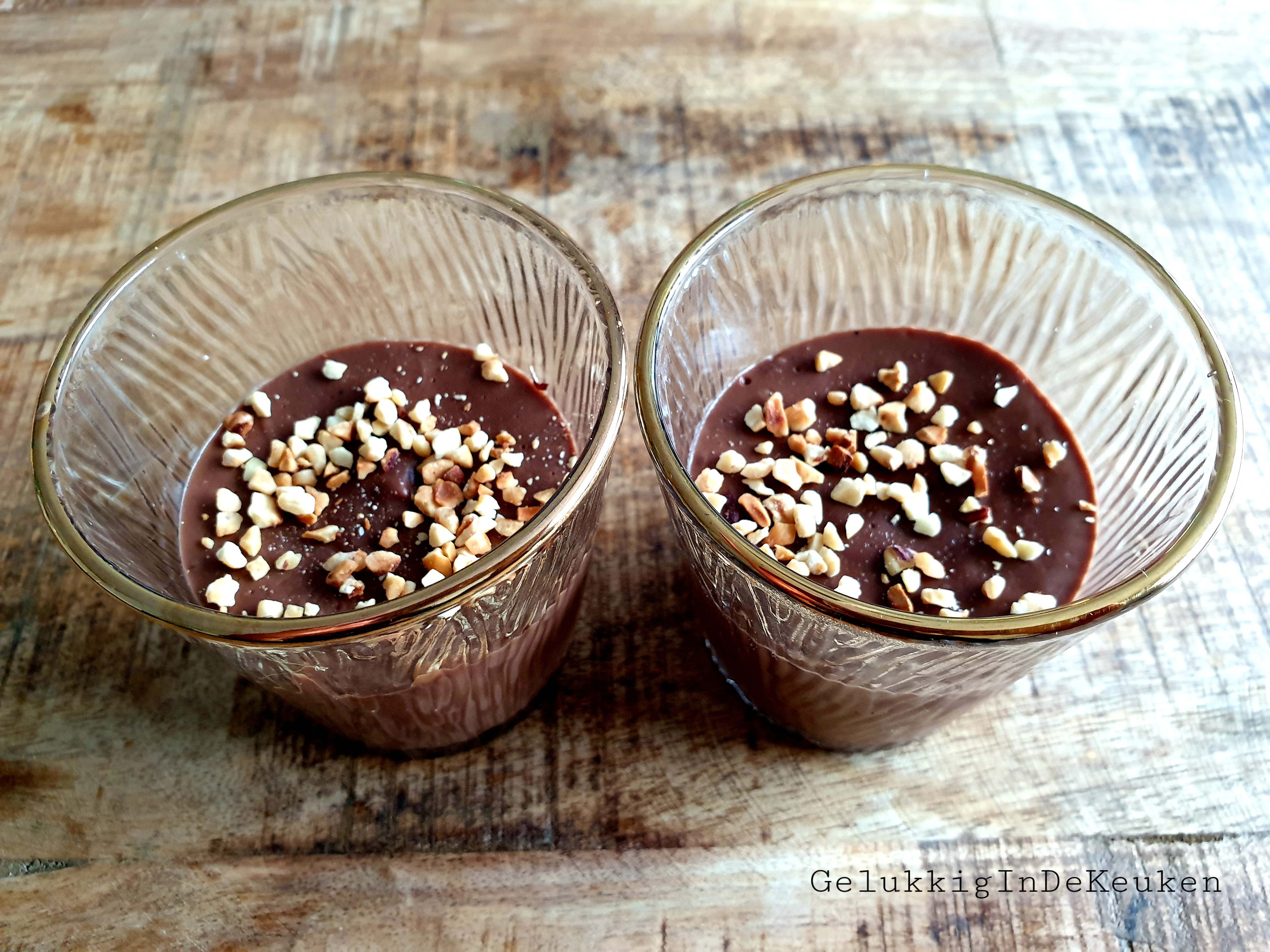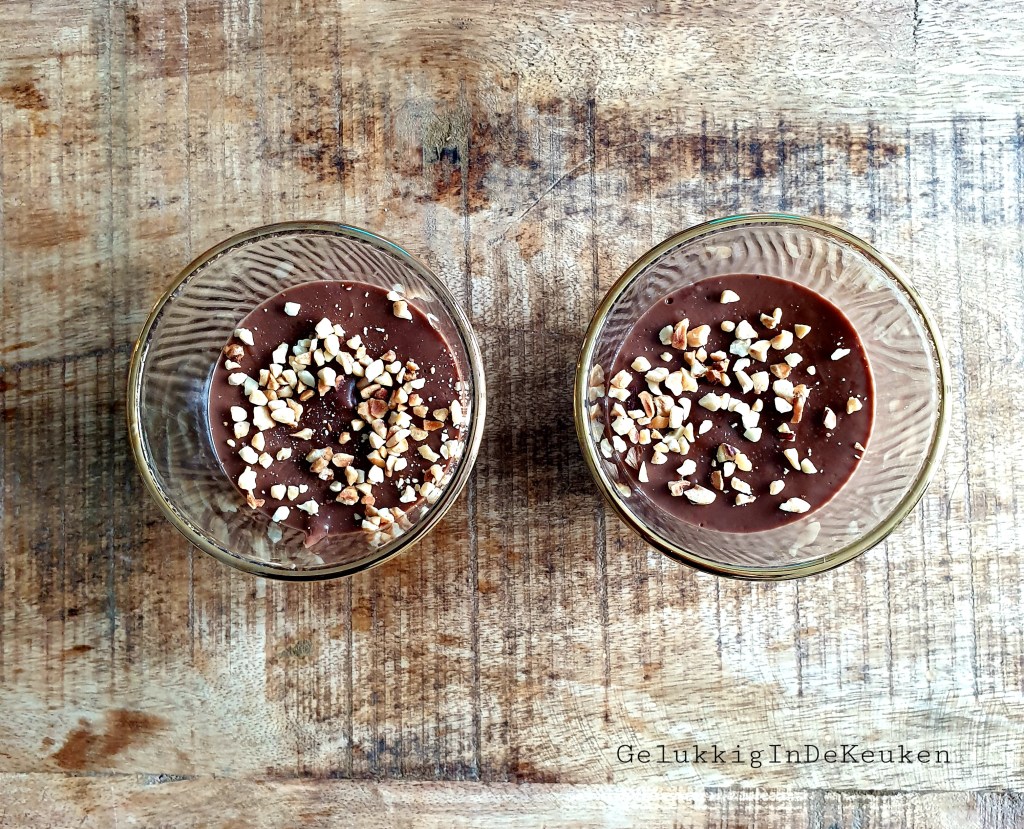 Zet het vuur uit en schenk het mengsel in kleine glazen of potjes. Laat het afkoelen en zet het vervolgens afgedekt met folie in de koeling voor minstens 3 uur. Haal het toetje ongeveer 15 minuten voordat je het gaat serveren uit de koeling, zodat het op kamertemperatuur kan komen. Gebruik een topping naar keuze, bijvoorbeeld geroosterde hazelnootstukjes.