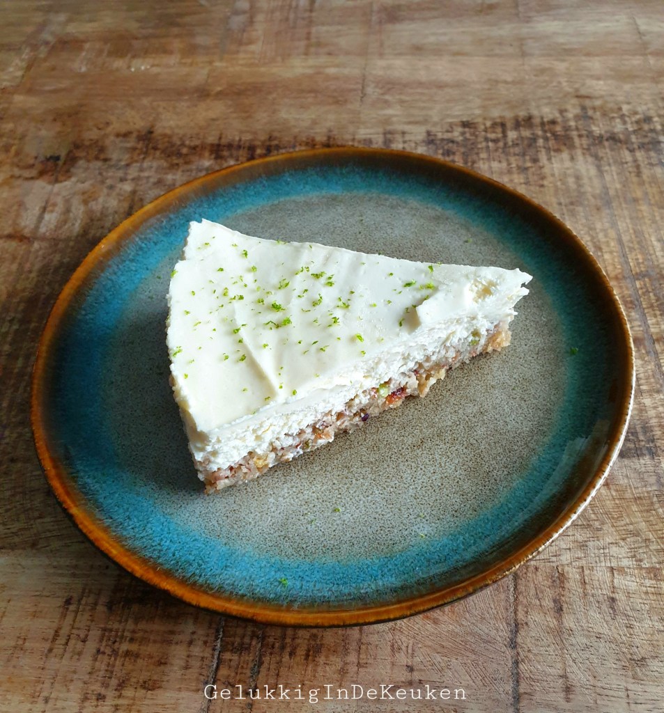 Zodra de cheesecake is afgekoeld in de koeling zetten voor minimaal 4 uur. Garneer de cheesecake eventueel met wat limoenrasp of rode vruchten.