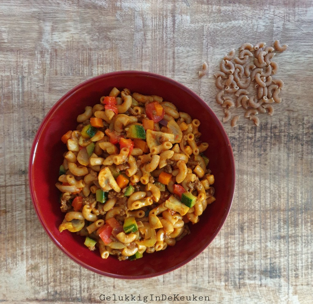 Volkoren elleboog pasta met gehakt en groenten op smaak gebracht met tomatenpuree en specerijen.