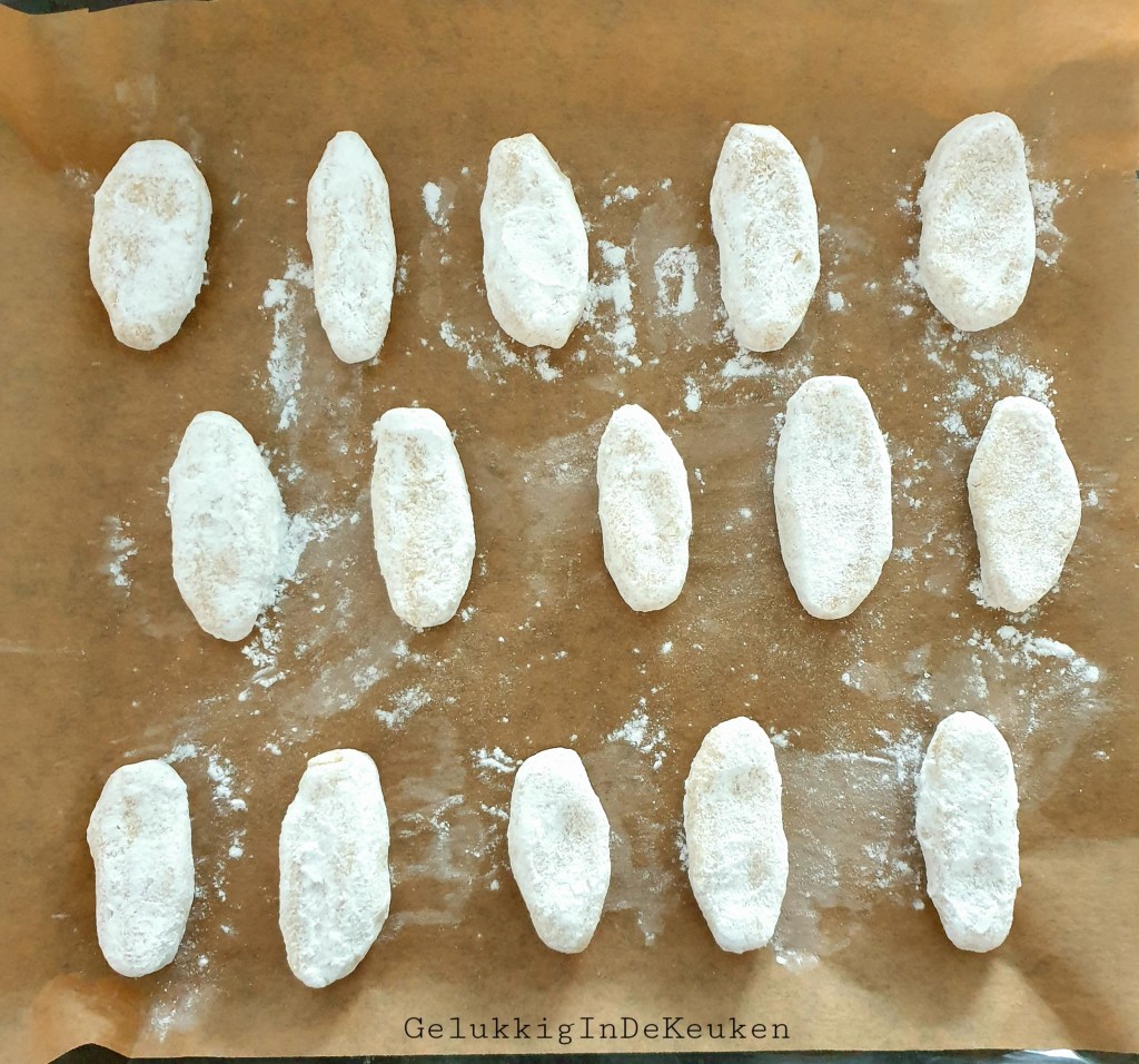 Rol met de hand kleine balletjes (ca. 2 cm doorsnede) en vorm het tot een ovaal vorm van 3 cm lang. Druk het vervolgens een beetje plat tot 1 cm dik. Haal het rondom door de poedersuiker en leg ze op een bakplaat bekleedt met bakpapier. Niet te dicht op elkaar, want ze lopen een beetje uit. Laat de koekjes zo een half uur staan. Verwarm ondertussen de oven voor op 160 graden.