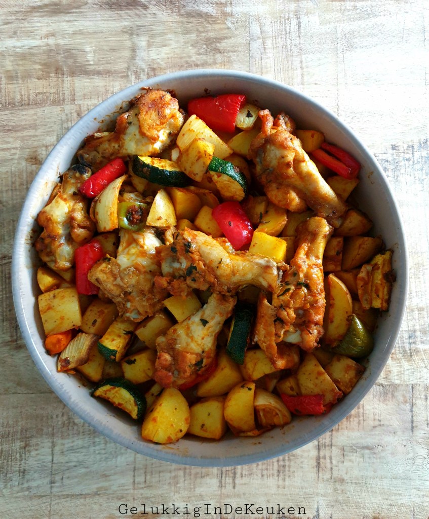 Lekker gekruide kipkluifjes en aardappelen uit de oven. Marineer de kipkluifjes bij voorkeur een aantal uren van te voren, zodat de smaken goed kan intrekken. Als je geen grote ovenschaal hebt, gebruik dan 2 ovenschalen.