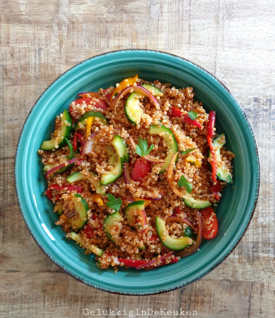Een beetje pittig en frisse salade. De quinoasalade is lekker als lunch. Pas de hoeveelheid harissa naar eigen smaak aan. Maak de quinoa het liefst een dag van te voren of een paar uur van te voren, zodat het goed afgekoeld is. Was de quinoa voordat je het gaat koken in een fijne zeef onder stromend water, zodat het straks niet bitter gaat smaken.