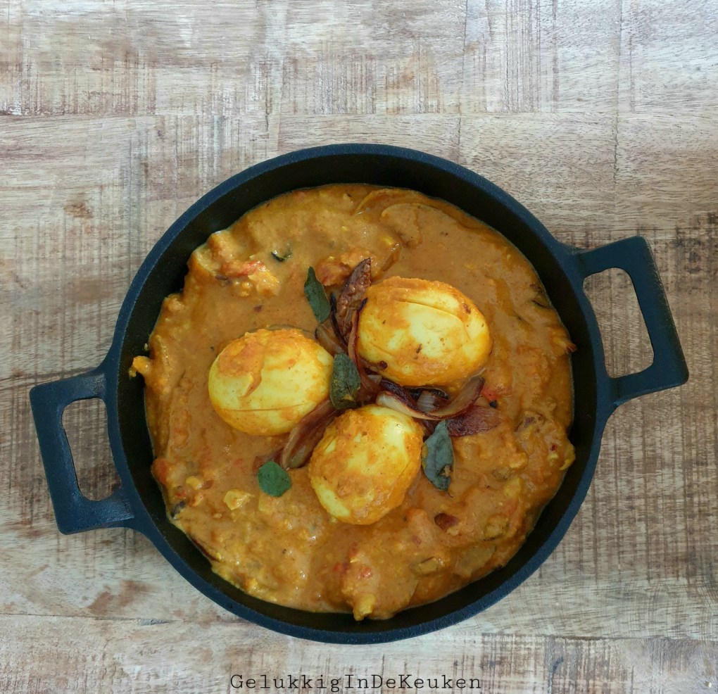 Ei curry in een rijke en volle saus van yoghurt, kokosmelk, cashewnoten en specerijen. De cashewnoten zorgt voor een dikke en romige saus. Neem rauwe cashewnoten, dus ongebrand en ongezouten. Laat de cashewnoten 20 minuten in warm water weken, zodat het zacht kan worden en makkelijk is te pureren. De curry kan je serveren met naan of roti. Ook lekker als lunch met brood.
