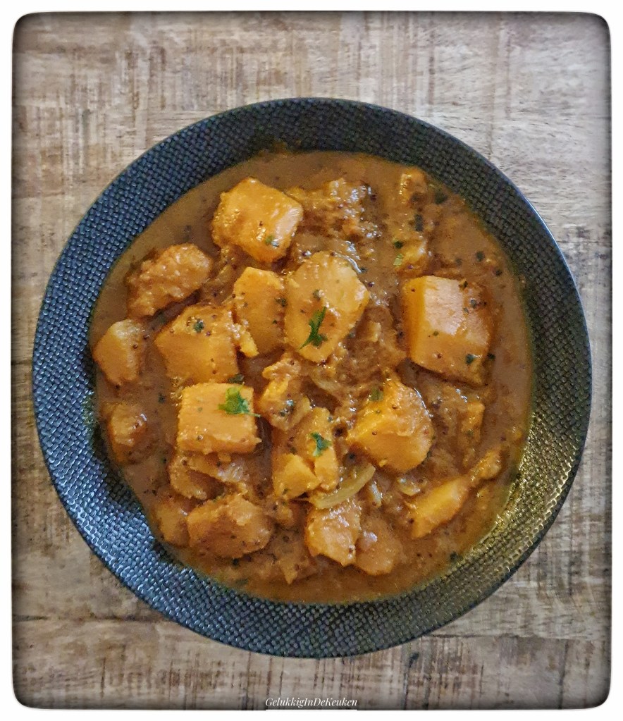 Pompoencurry gestoofd in kokosmelk en specerijen.