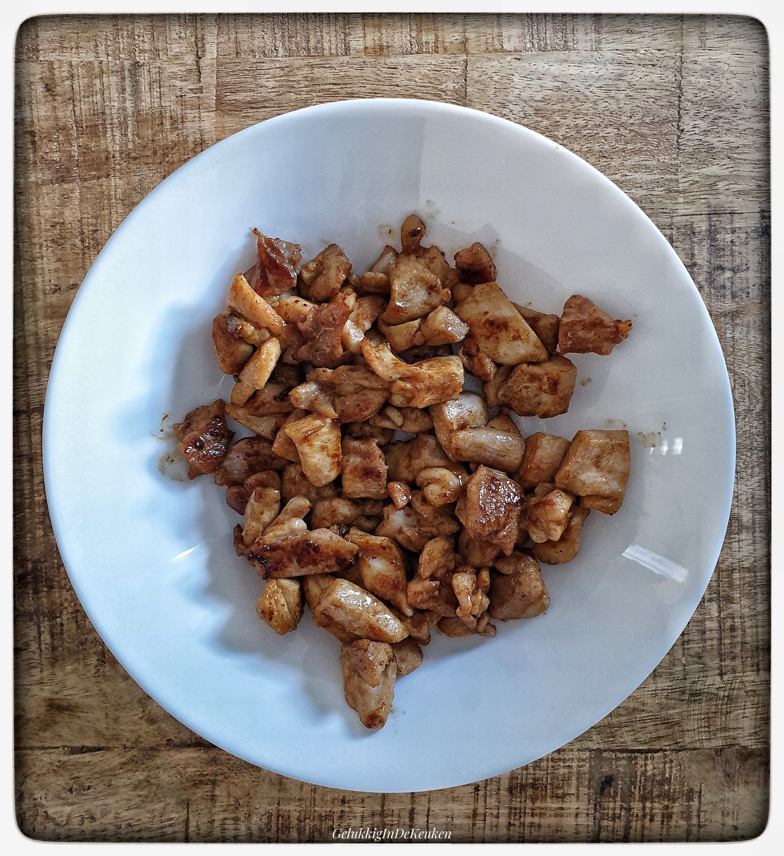 Verhit de olie in een ruime koekenpan op hoog vuur en bak hierin de stukjes kip gaar. Haal ze vervolgens uit de pan en leg ze op een bord.