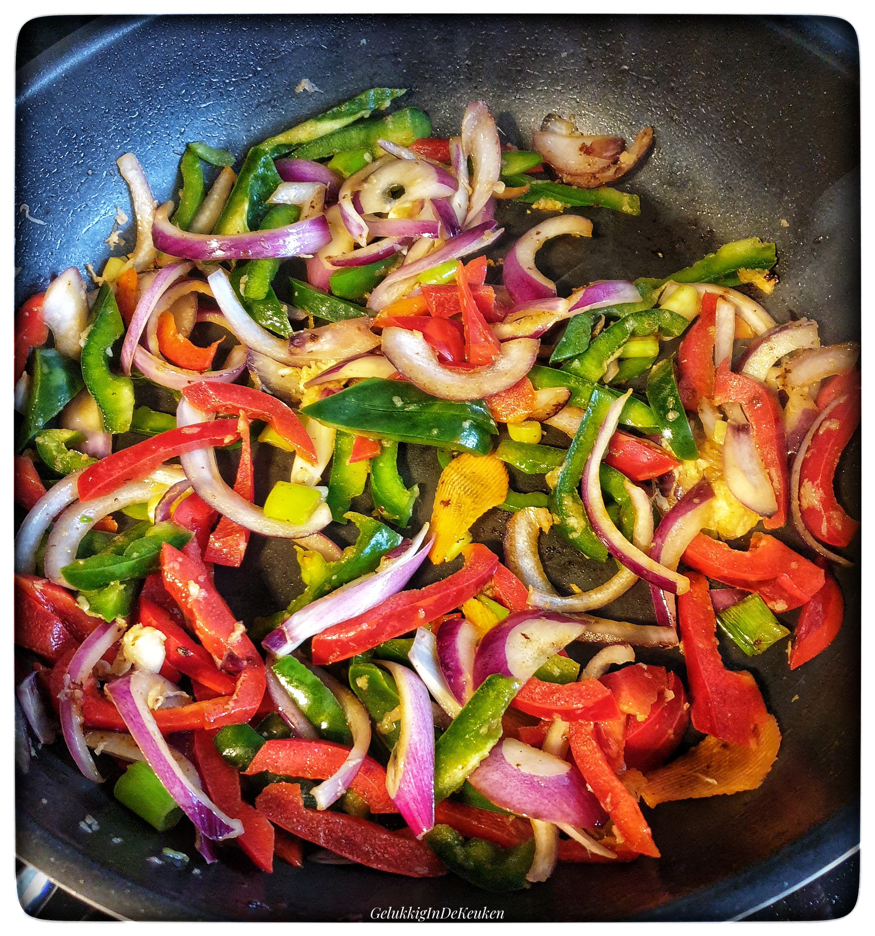 Bak in de koekenpan de ui op middelhoog vuur tot zacht en glazig. Indien nodig 1 tl olie toevoegen. Voeg de knoflook en gember toe en bak 1 minuut mee. Voeg de groenten toe en begin met de groenten die het langst nodig heeft. Zodra de groenten gaar zijn de noedels, stukjes kip en de saus toevoegen. Verwarm het geheel al omscheppend voor 2 minuten.