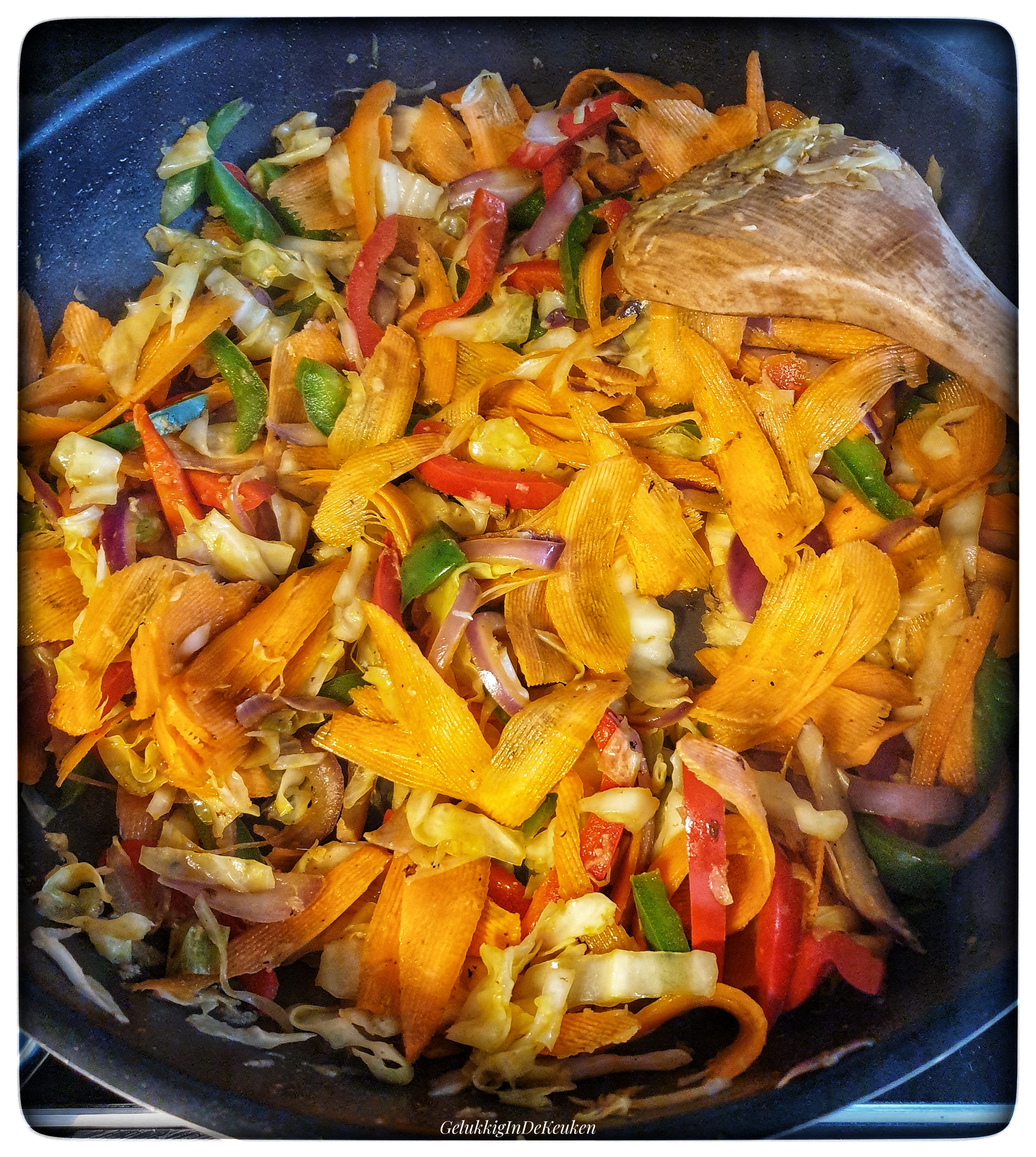 Kook de noedels volgens de verpakking, giet het af en spoel na met koud water. Ga intussen verder met het bakken van de groenten.