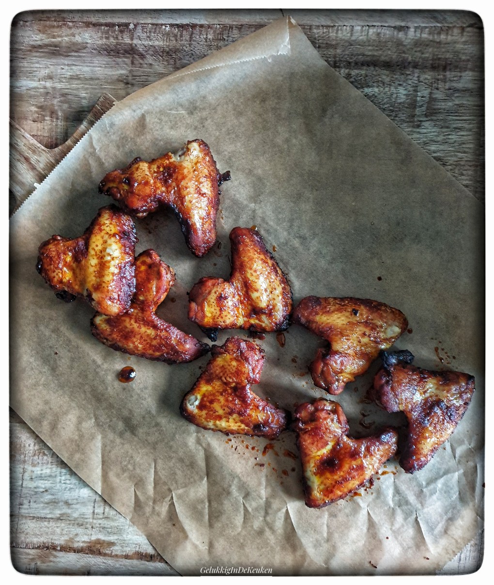De kipvleugels worden gemarineerd in een harissa-dadelmarinade en gegaard in de oven. Ze zijn een beetje pittig en een beetje zoet.