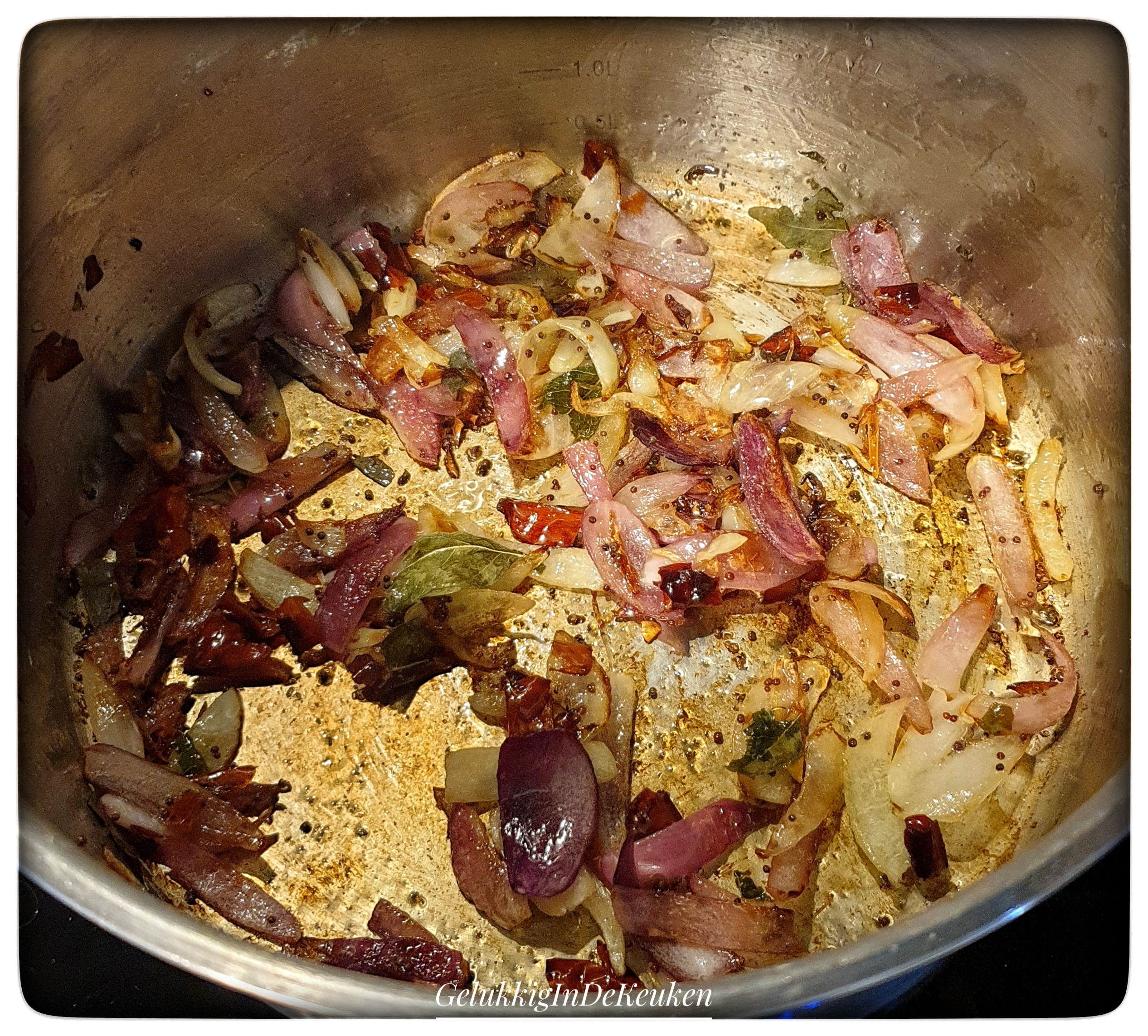 Voeg nog een 1/2 el olie toe en doe de mosterdzaadjes, curryblaadjes en chilipepers erbij en bak het 5 minuten mee. Roer regelmatig.