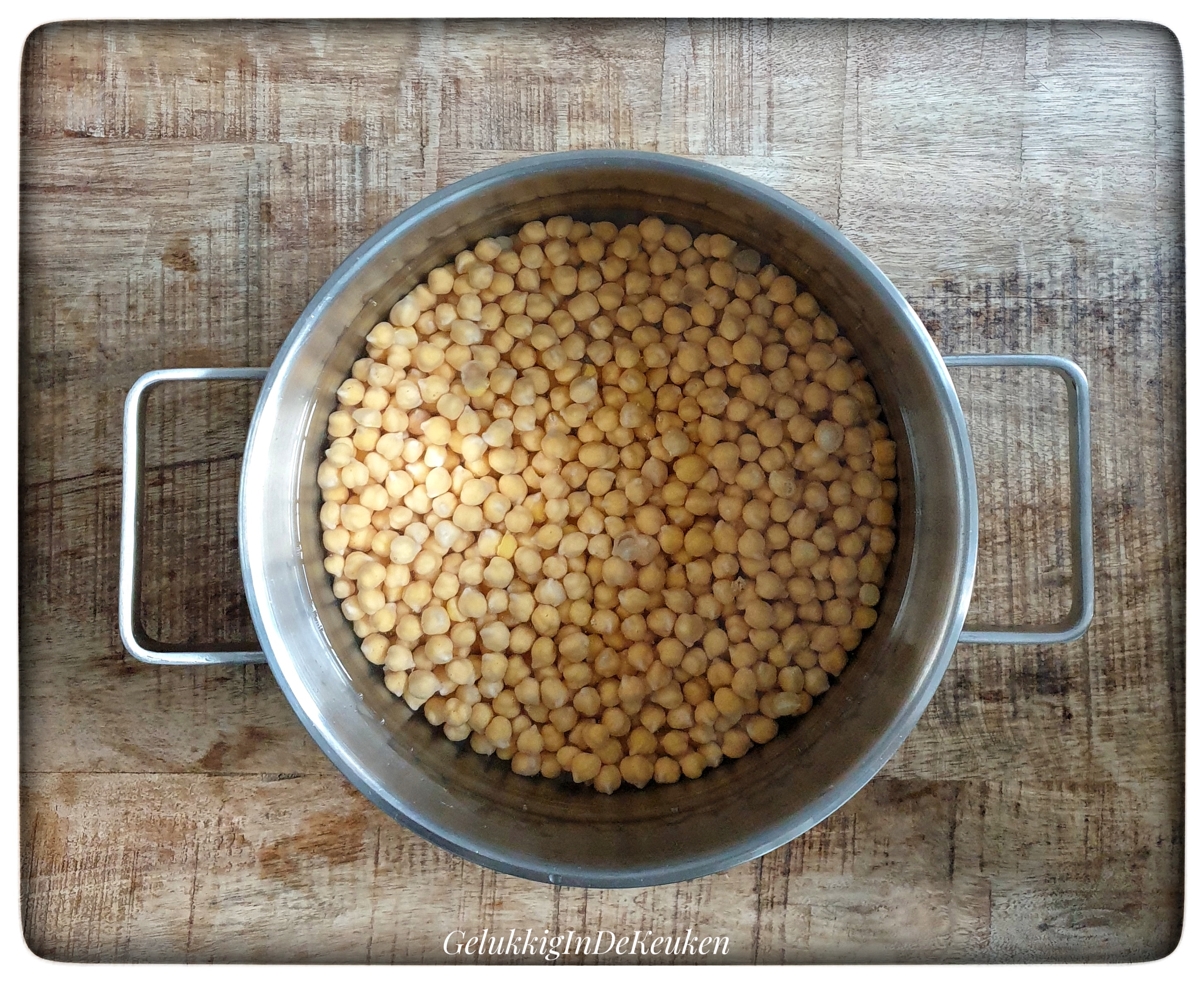Als je dit gerecht wil maken, moet je de kikkererwten eerst een nachtje laten weken in ruim water.