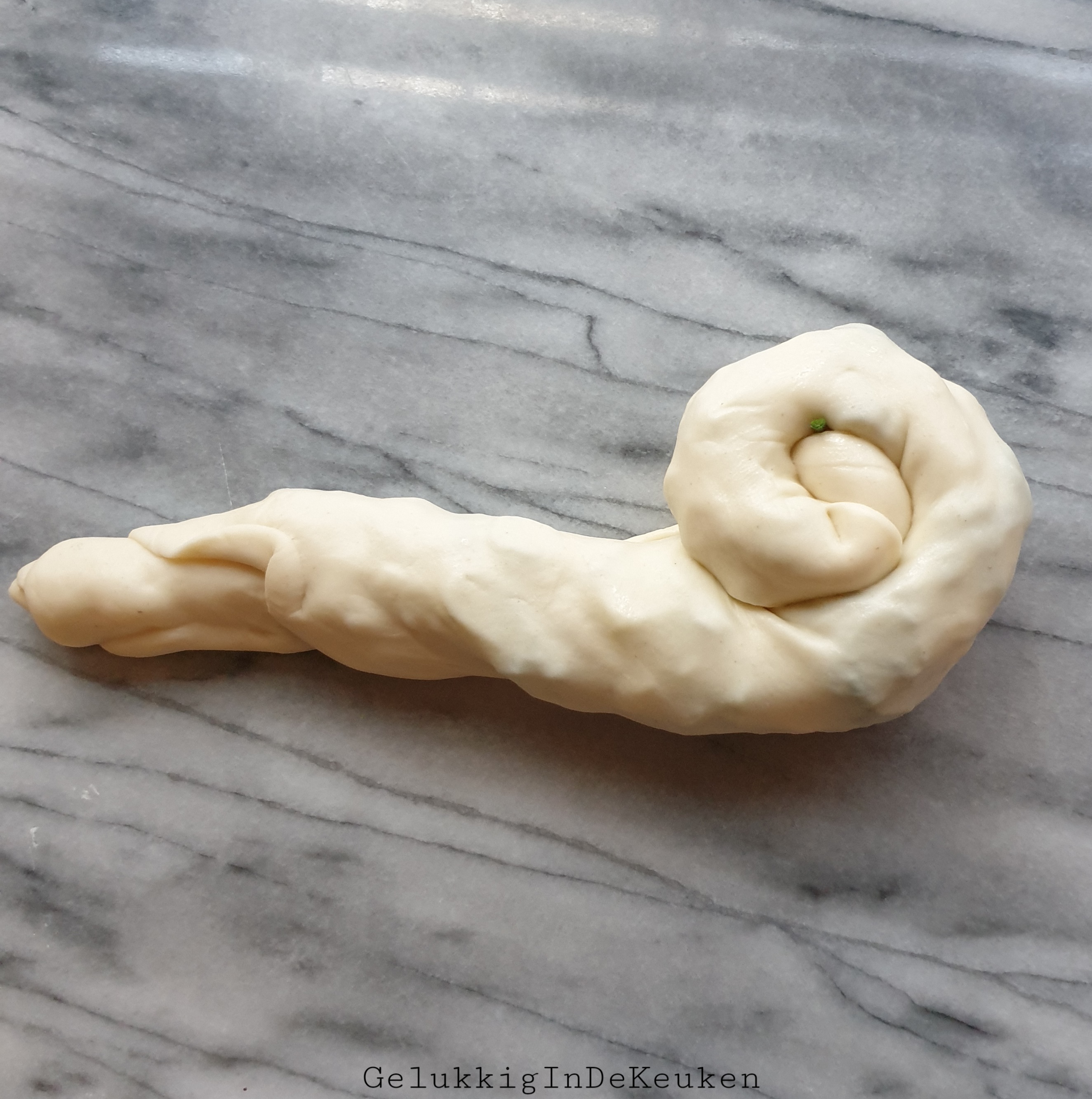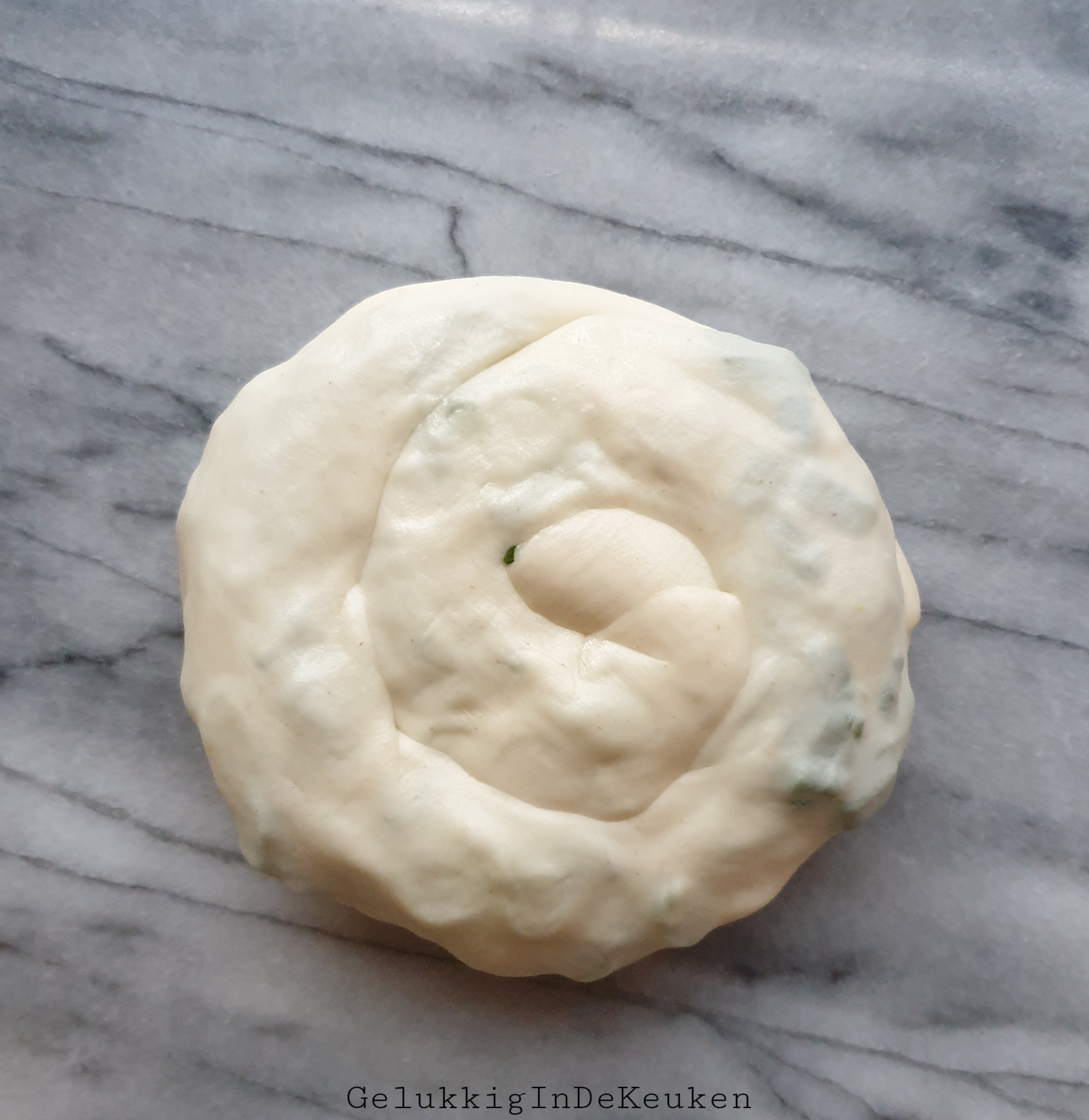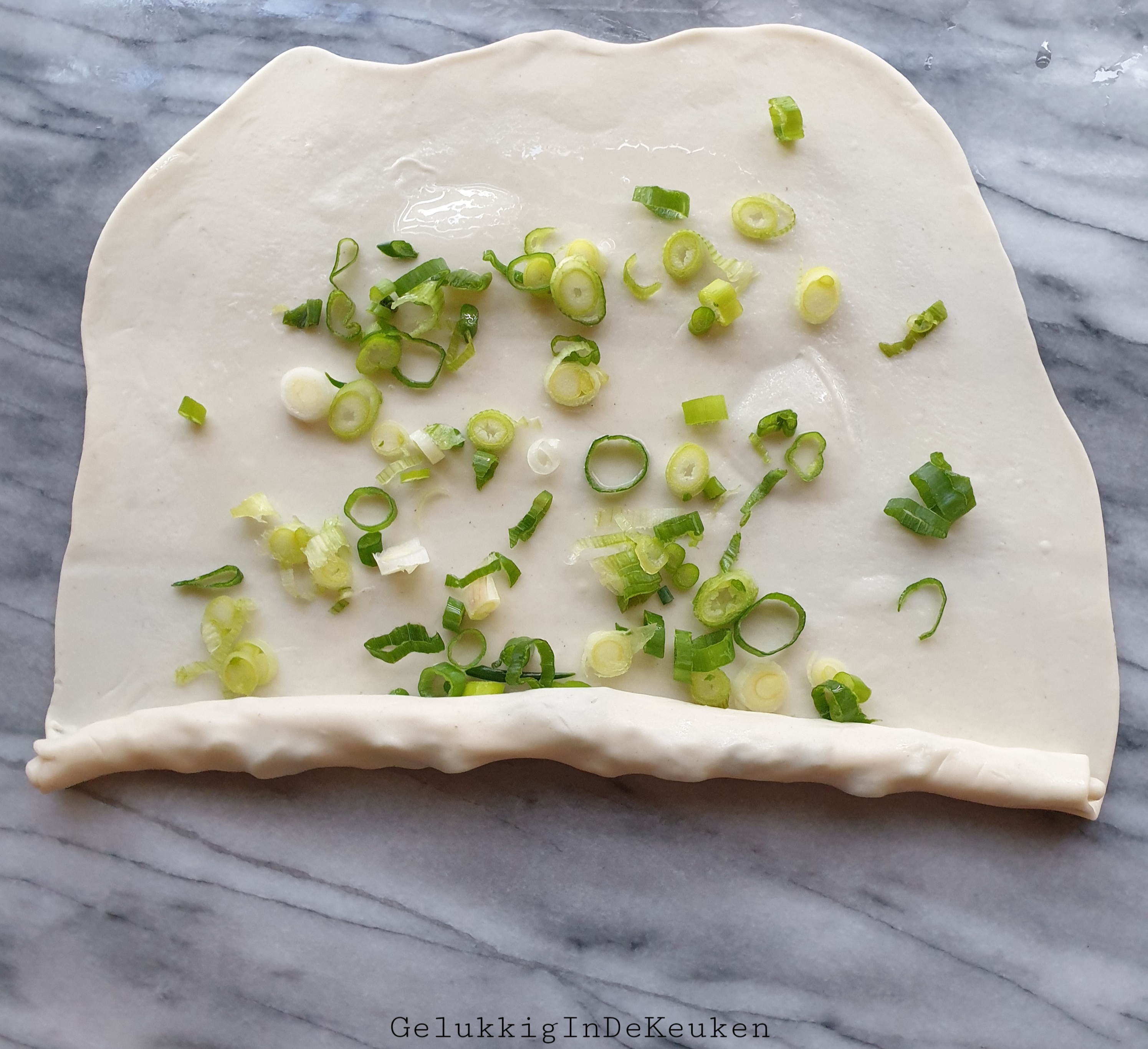 Rol het deeg uit tot een dunne pannenkoek. Smeer het in met een beetje olie en bestrooi met de lente-ui (de randjes vrijlaten). Rol het deeg dun op en draai vervolgens in een cirkel, zie foto’s. Rol het het weer uit tot een dunne pannenkoek. Het is niet erg als er wat lente-ui uit het deeg steekt.