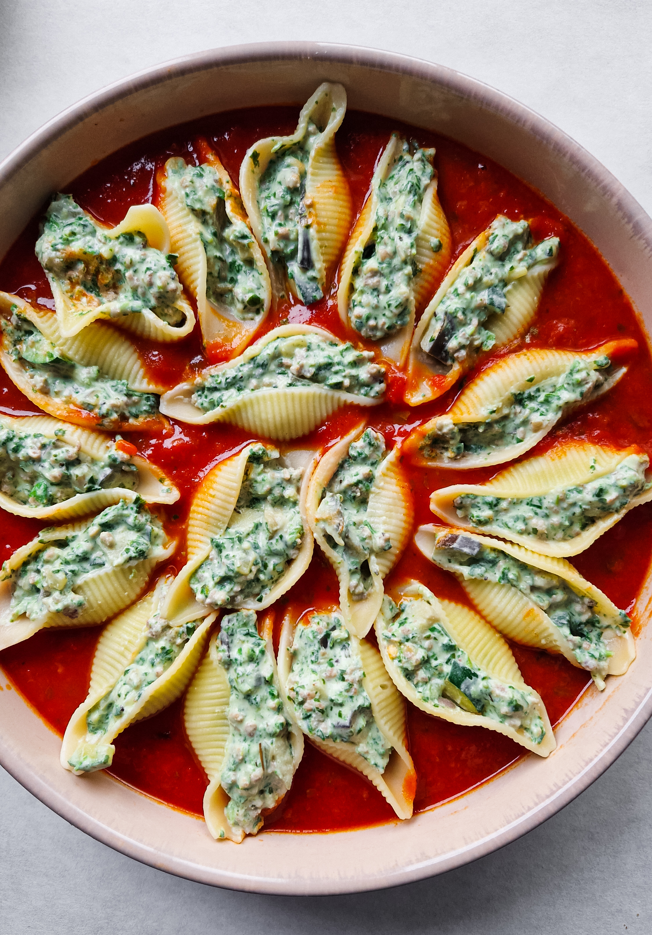 Schelpjes pasta gevuld met ricotta, spinazie en aubergine in tomatensaus.