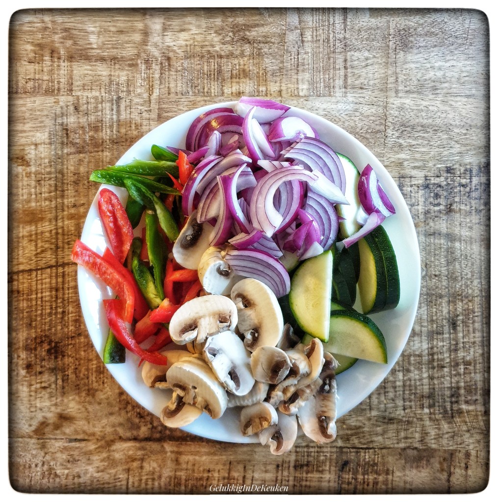 Wokgerechten zijn handig om restjes groenten op te maken. Qua groenten kan je dan ook varieren met wat je in huis hebt.