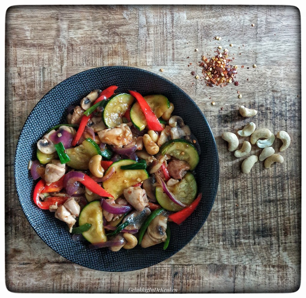 Doe de woksaus en cashewnoten erbij en roerbak nog 3 minuten. De woksaus zal iets indikken. Zet het vuur uit en roer de groene gedeelte van de lente-ui door de wok.