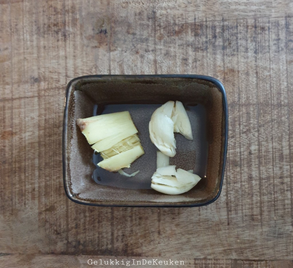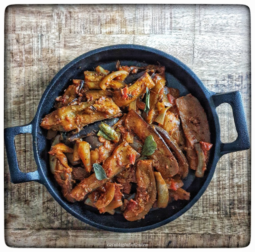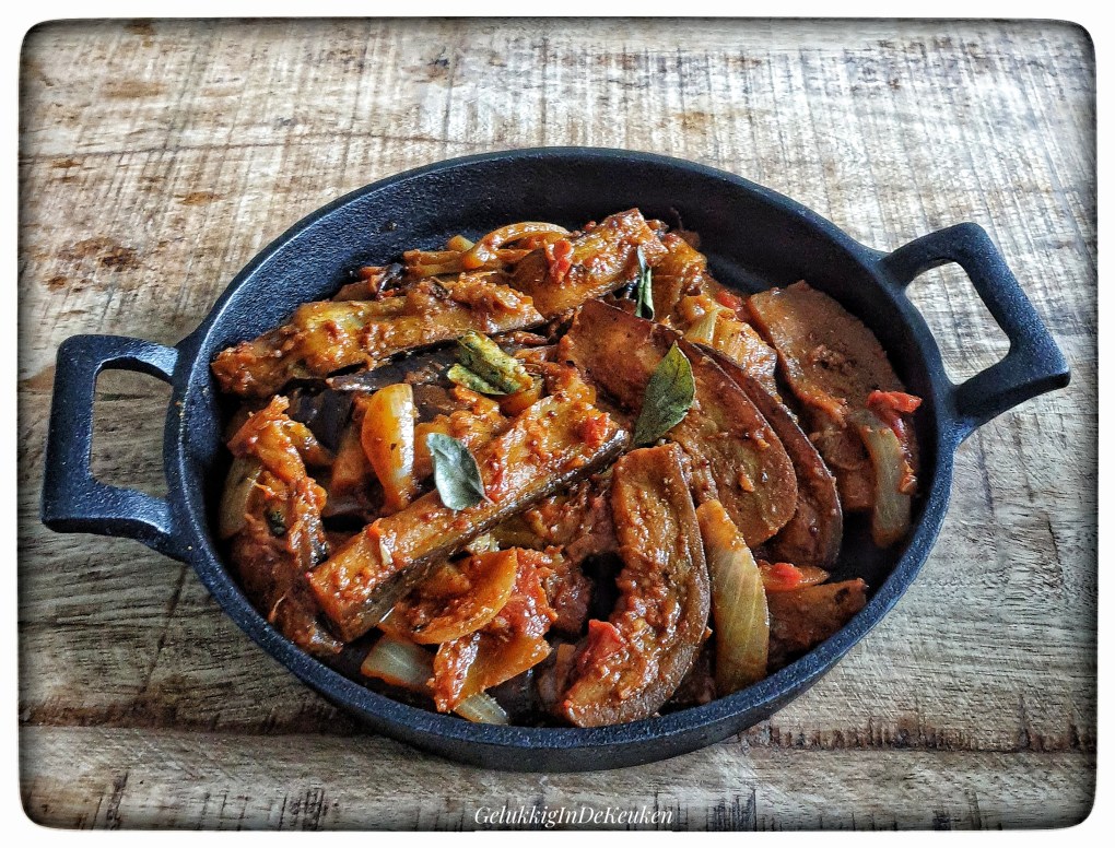 Ik heb de aubergine in een flinke scheut olie gebakken, maar je kan het ook frituren. De gebakken aubergine wordt op smaak gebracht met knoflook, gember, tamarinde, kokosmelk en specerijen.