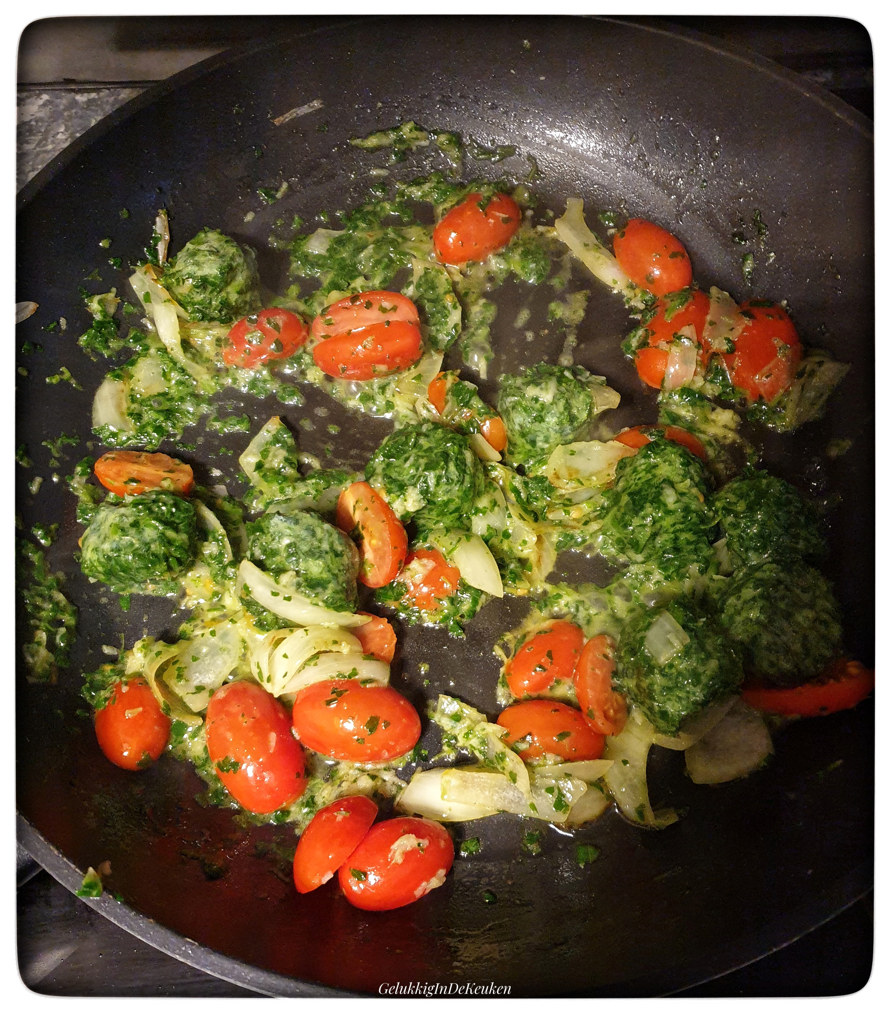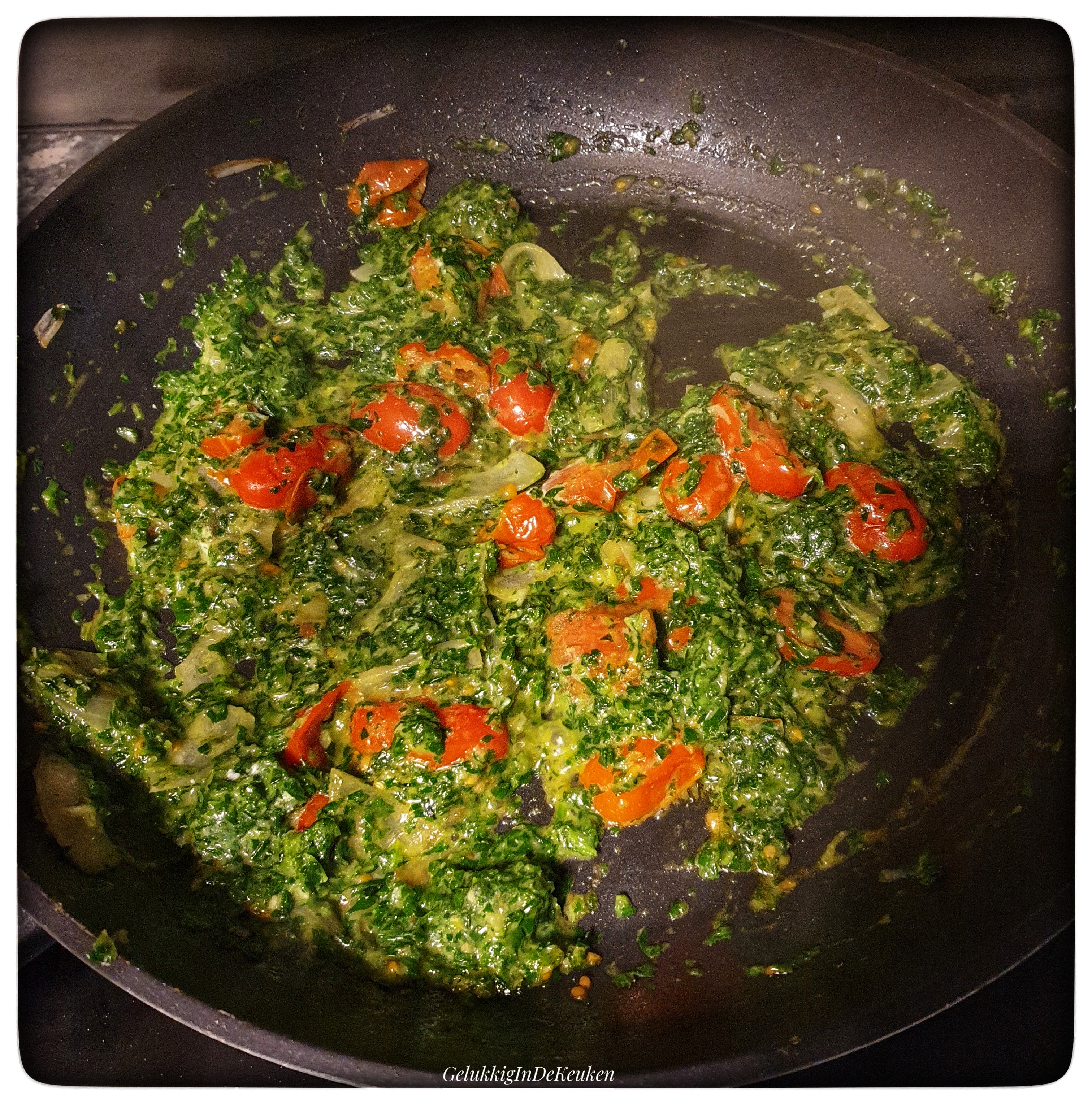 Verhit intussen de olie in een koekenpan op matig-laag vuur en fruit hierin de ui voor een paar minuten. Voeg de spinazie, knoflook, chilivlokken en tomaten toe en bak het voor 5 minuten. Roer af en toe.