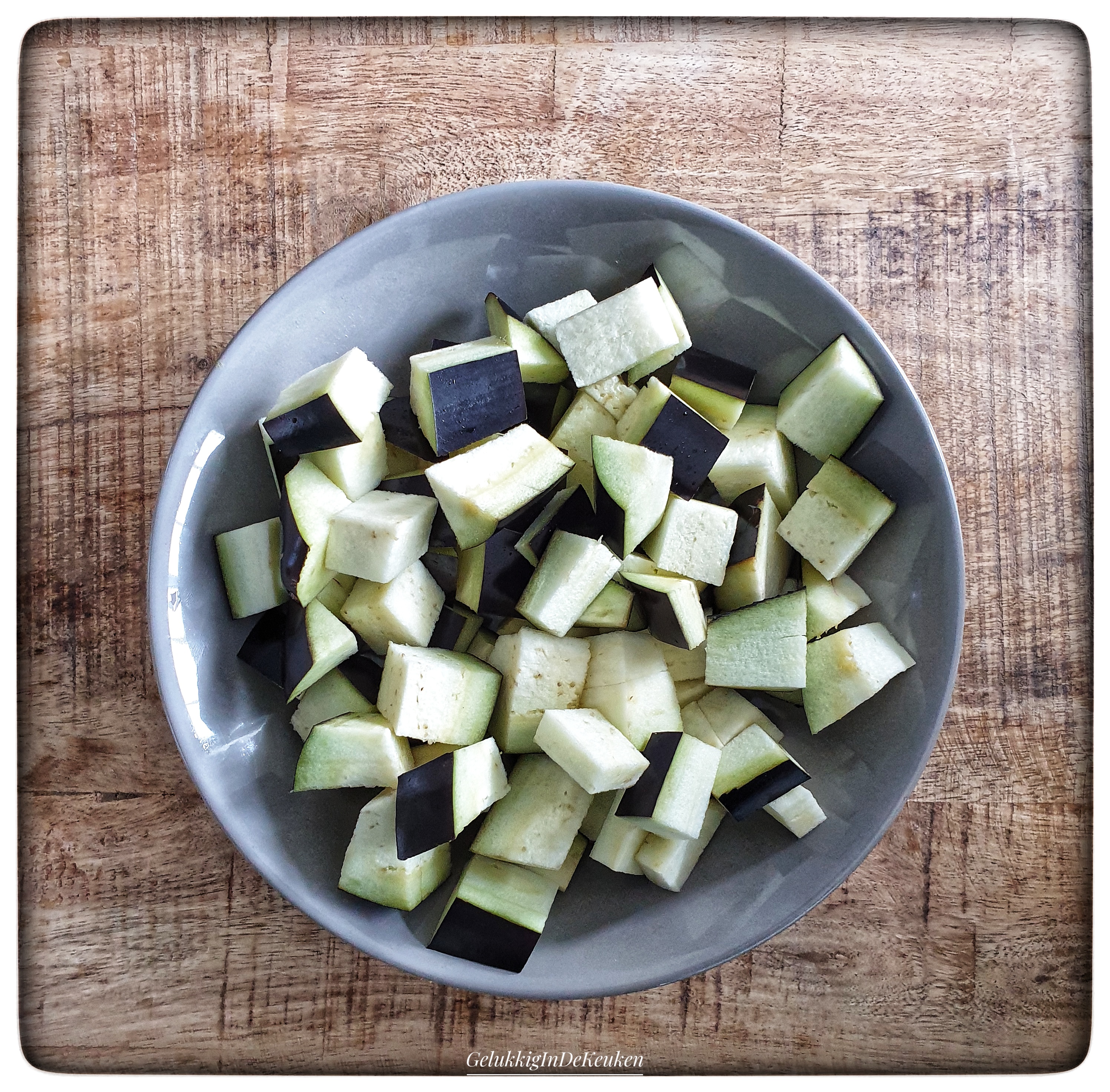 Snijd intussen de aubergine in ongeveer 1 1/2 x 2 cm stukken en meng met de kurkuma. Snijd de ui in halve ringen.
