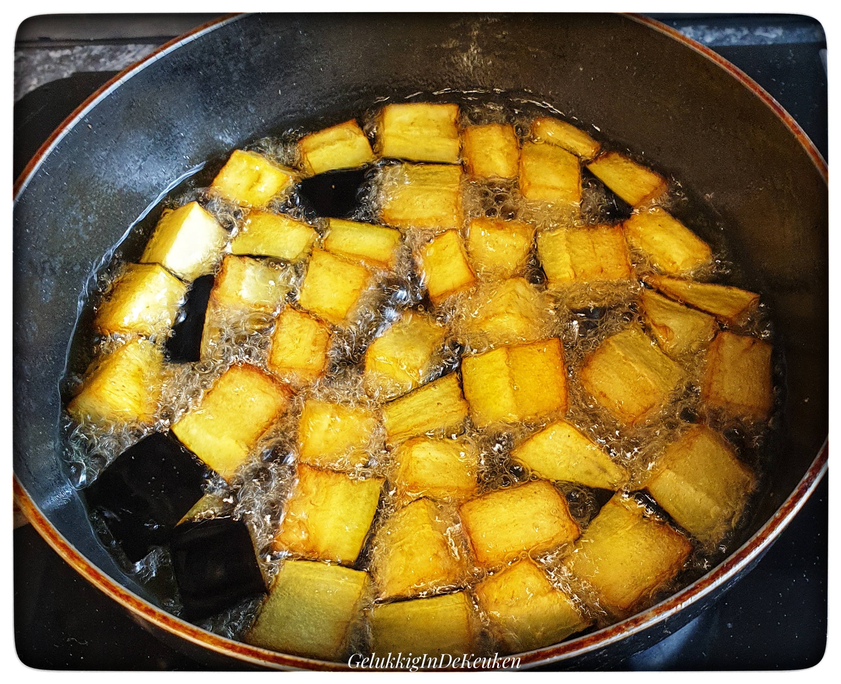 Zodra het vuur heet is de aubergine frituren tot goudbruin en gaar, ca. 4-5 minuten (frituur de aubergine in twee delen). Haal de aubergine eruit en leg op een bord met keukenpapier om uit te lekken.