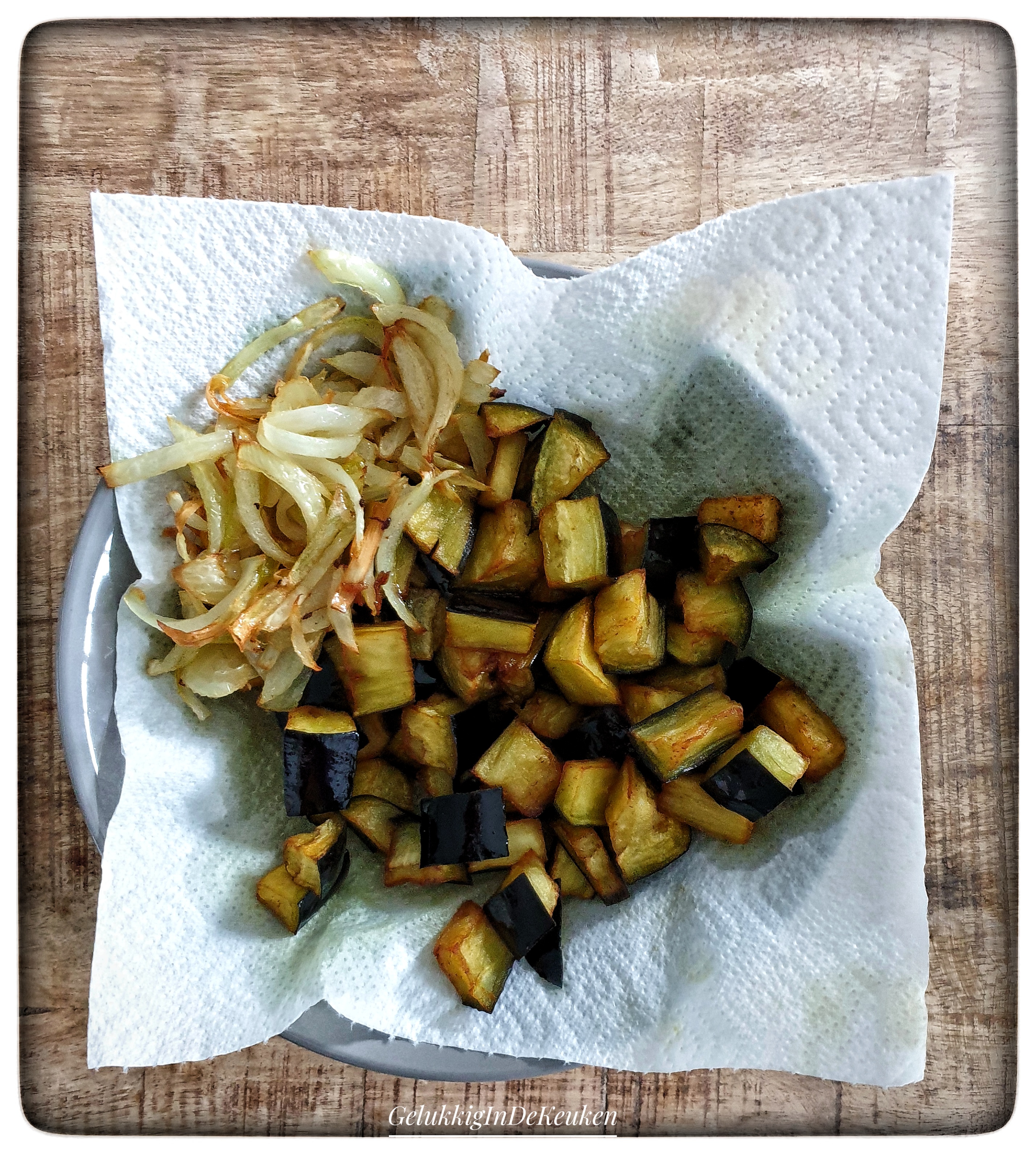 Frituur vervolgens de ui in 3 minuten en leg ze bij de aubergine.