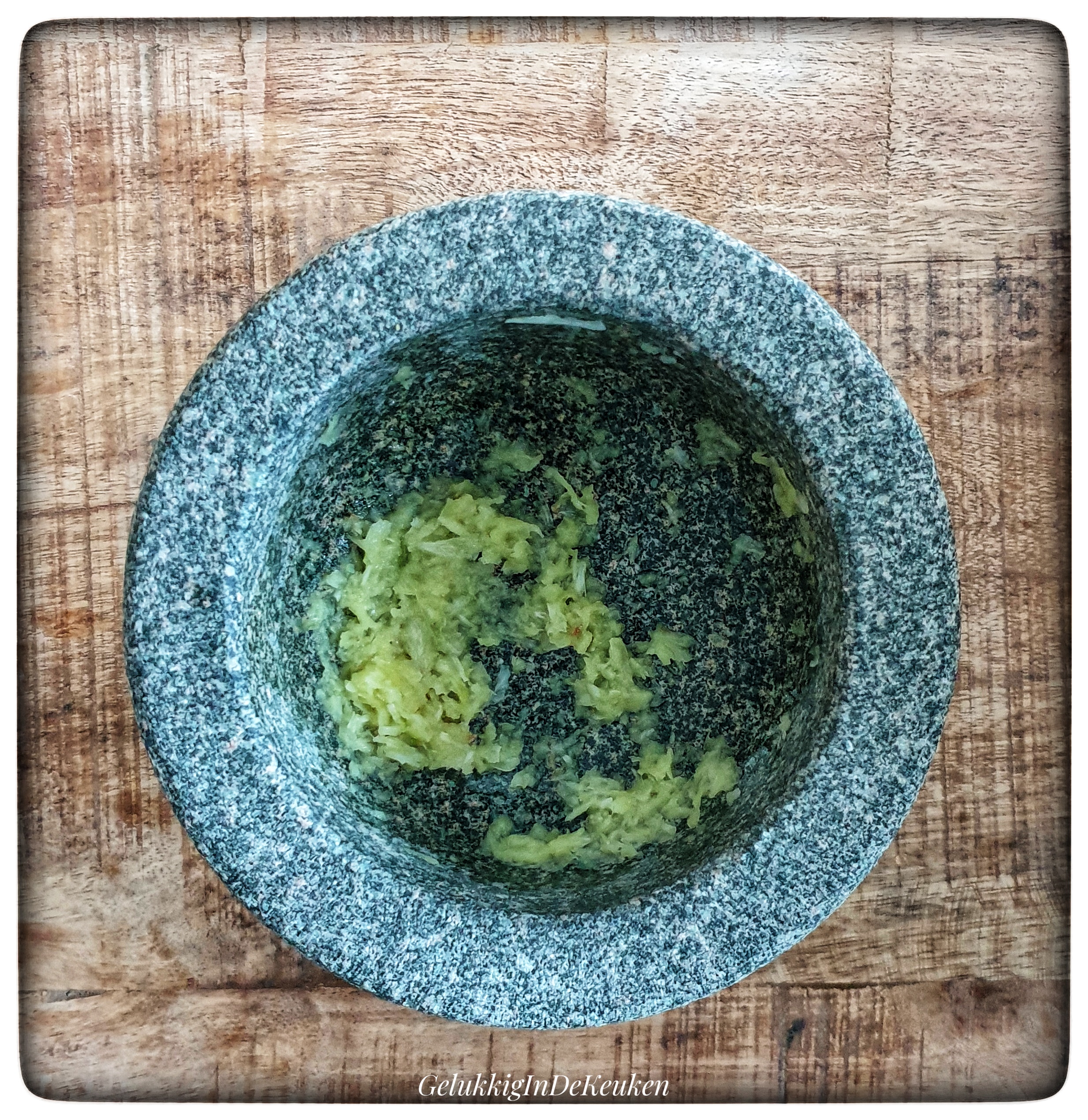 Vijzel de knoflook en gember tot een fijne pasta.