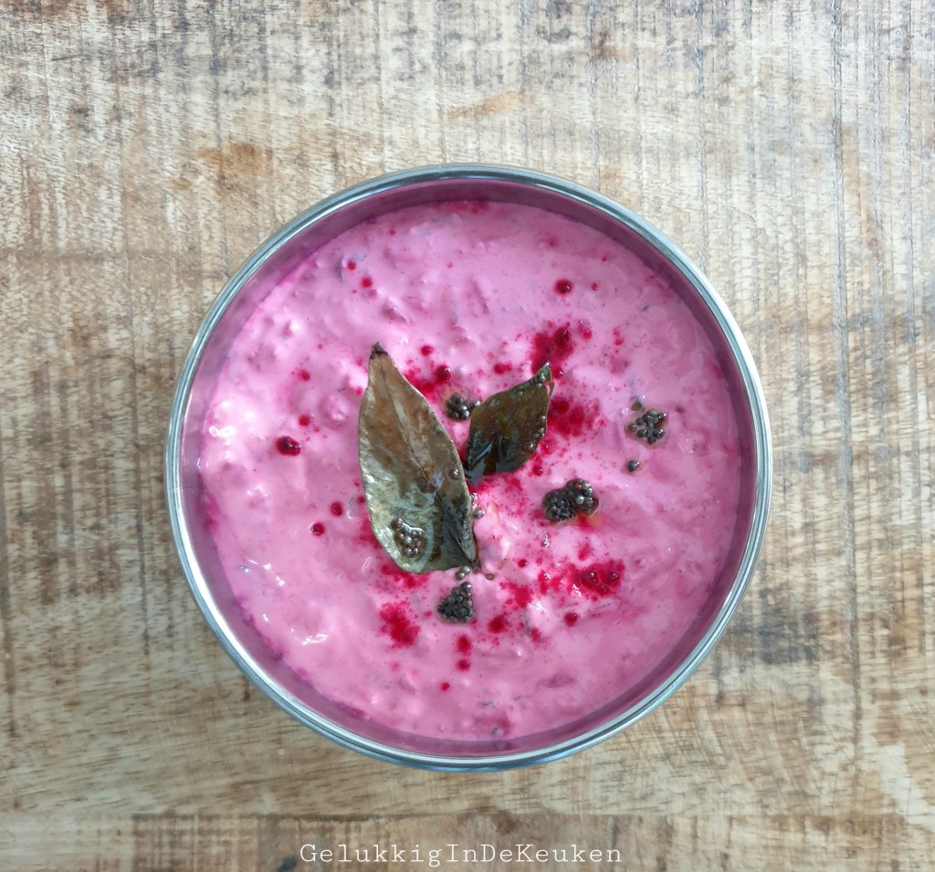 Raita geeft verkoeling bij een pittige curry. Er bestaan vele varianten van raita. Ik heb hieronder twee recepten, één originele met tomaat en komkommer en één met rode bieten. Kook de rode biet van te voren en laat het afkoelen.