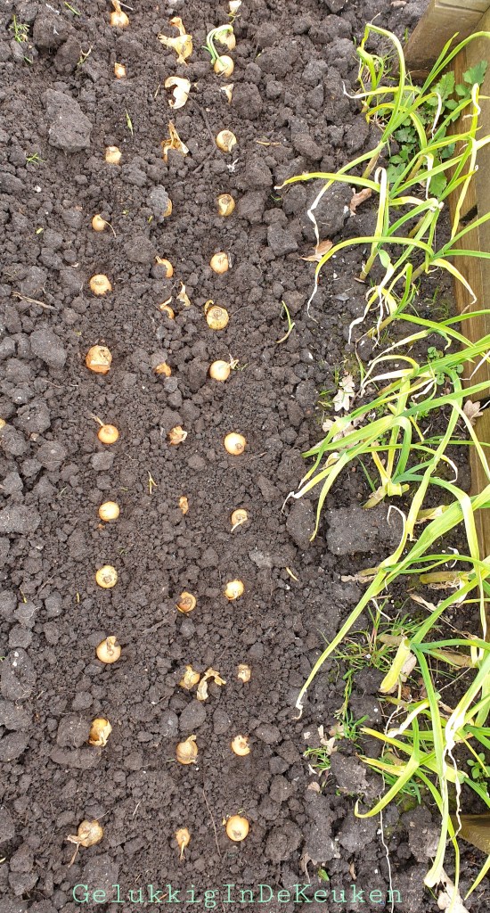 Vorig weekend heb ik uien en Sri Lankaanse sjalotjes gepoot. De Sri Lankaanse sjalotjes heb ik dit jaar voor het eerst, dus ik ben benieuwd of het gaat lukken. Van mijn collega heb ik Turkse (lente) uitjes gekregen, dus die heb ik ook meteen gepoot. Thuis heb ik nog rode uitjes liggen, deze stop ik over een week in de grond. De uitjes heb ik toegedekt met aarde en een vogelnet erover gespannen, zodat de kraaien er niet mee vandoor gaan.