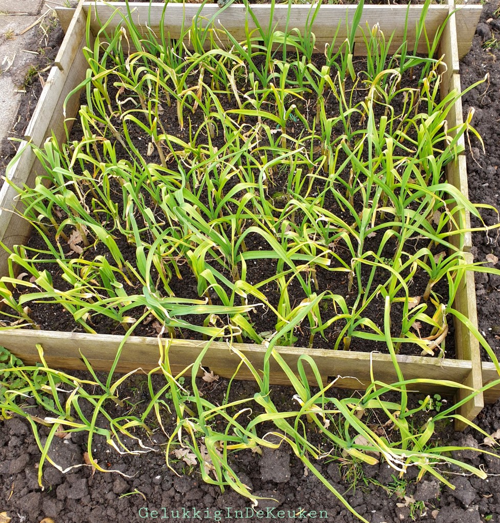 De knoflook staat er ook nog mooi bij… In mei/juni geef ik weer een beetje kalium, zodat het een mooi en stevige bol kan vormen. De bol vormt zich namelijk pas in juni/juli.