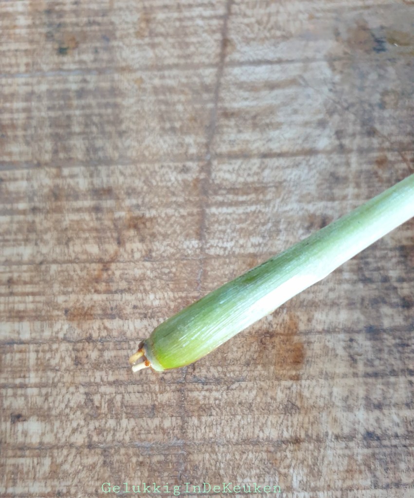 In de vorige blog heb ik laten weten dat ik aan het experimenteren ben met citroengras. Het gaat héél langzaam, maar bij twee stengels zie ik beginnende wortels. Bij de andere 2 stengels zie ik helaas niets.