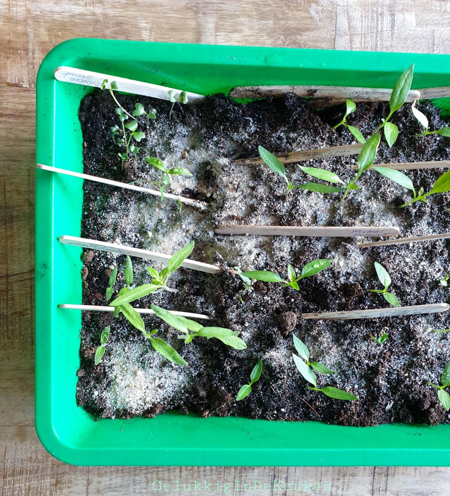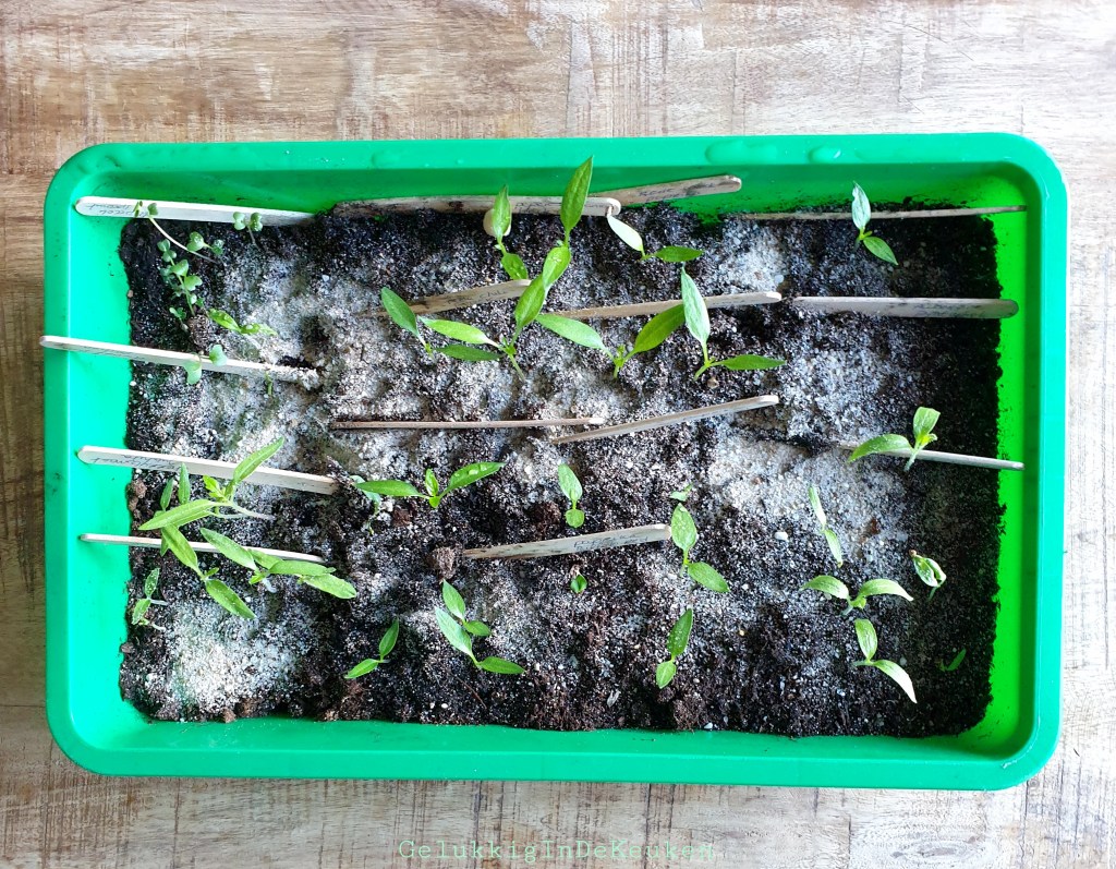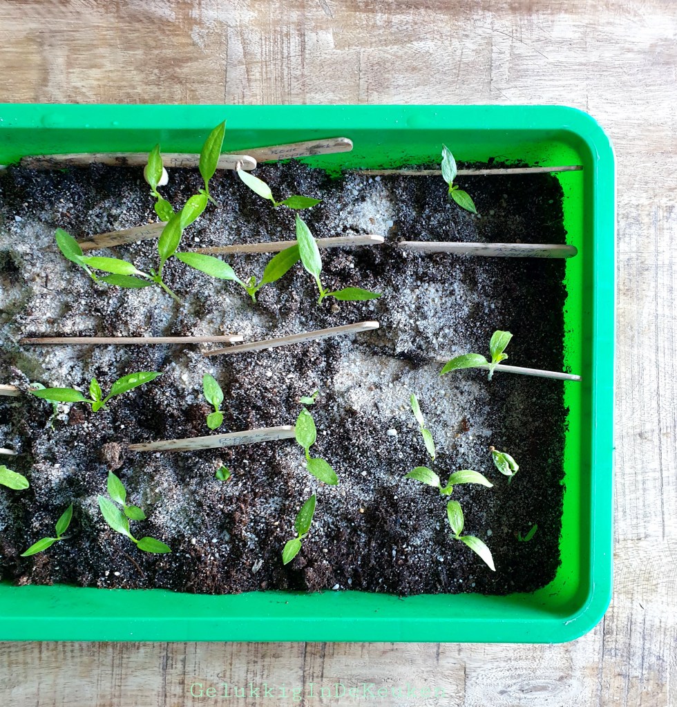 Ook de paprika en peper zaailingen gaan goed. De meeste plantjes krijgen nu twee blaadjes, de eerste twee blaadjes na het ontkiemen zijn kiemblaadjes. Zodra de echte blaadjes gegroeid zijn, ga ik ze verspenen in kleine potjes met potgrond, zodat ze voeding krijgen en verder kunnen groeien.