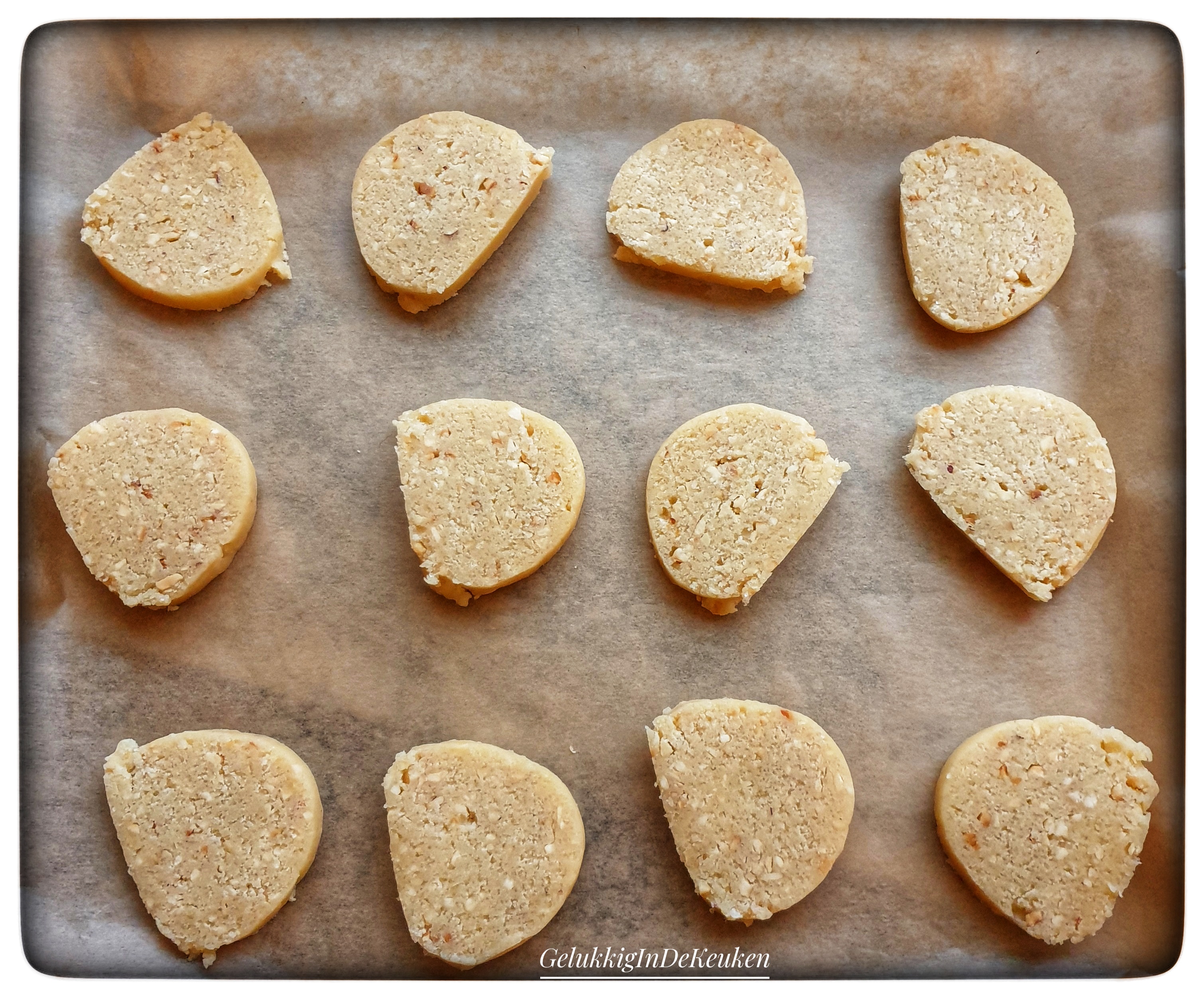 Snijd het deeg in plakjes van 3-4 mm dikte en leg op een bakplaat bekleedt met bakpapier. Bak de koekjes in 22 minuten gaar. Mocht je het in twee delen bakken, leg dan de resterende deeg in de koeling.