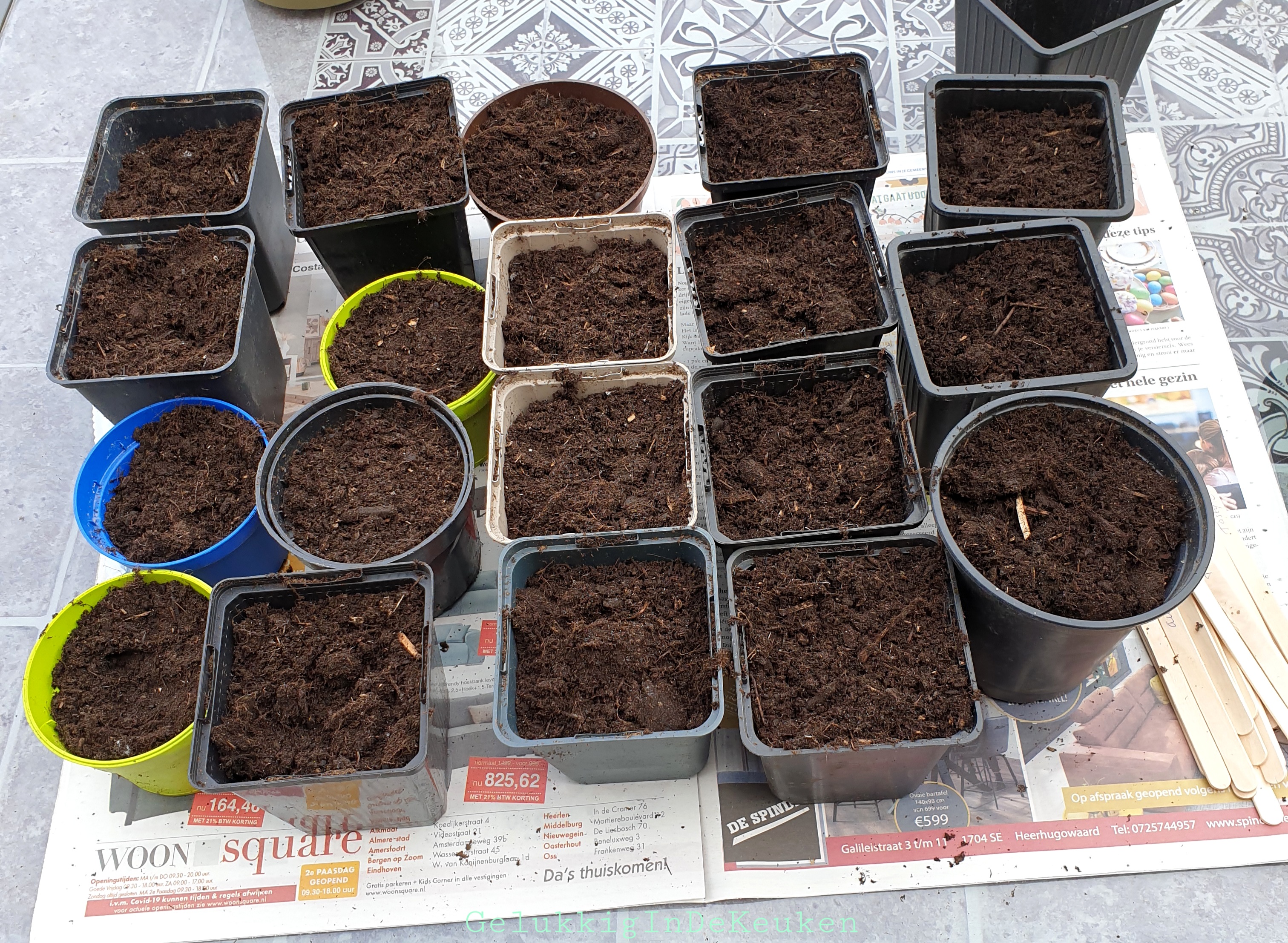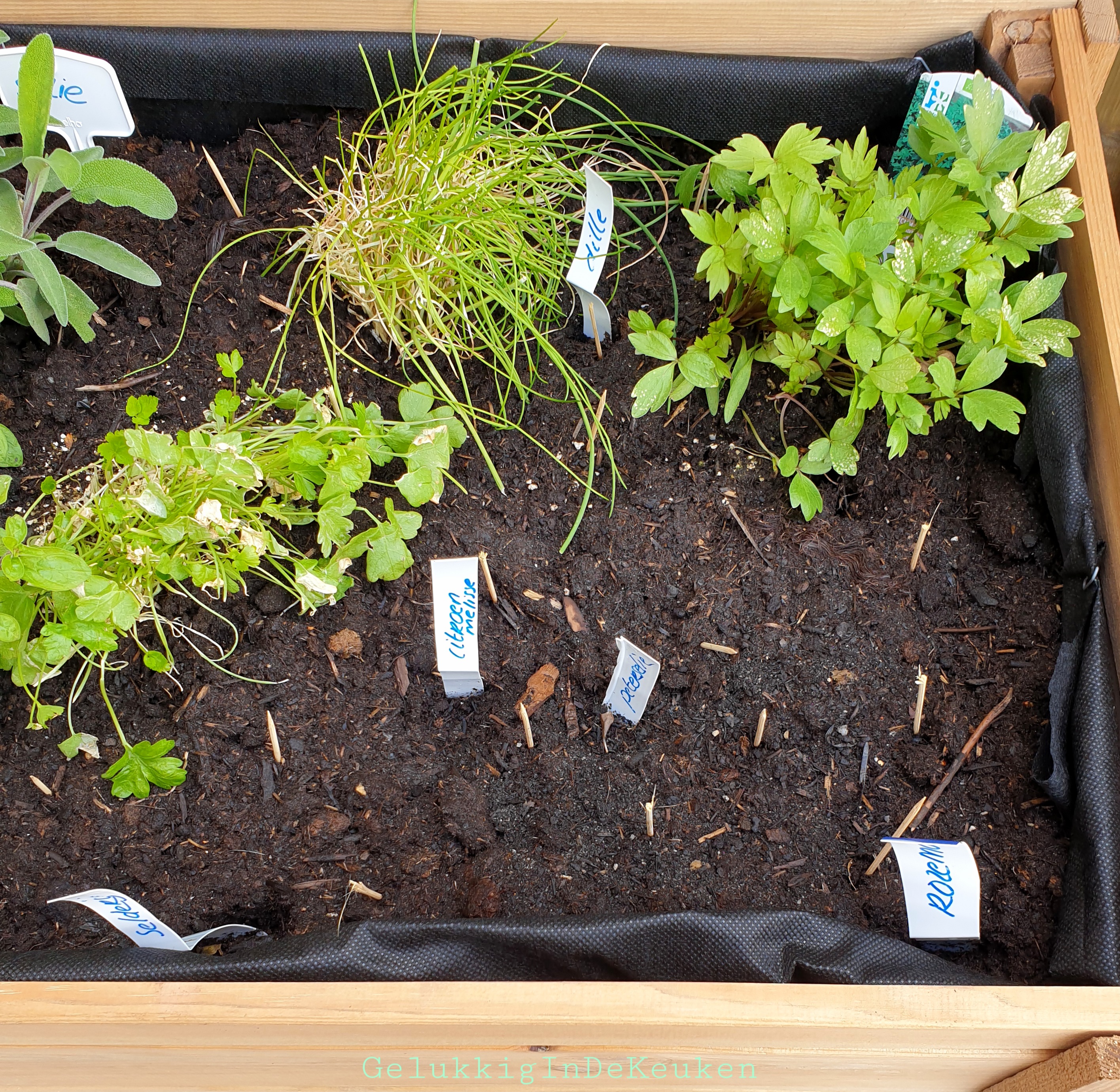 Ik heb buiten kruiden gezaaid zoals koriander, citroenmelisse, dille, bieslook, tijm en basillicum. Er is nog niets te zien. Misschien ben ik te vroeg geweest, want we hebben de laatste tijd aardig wat koude dagen en nachten gehad. Ik wacht het nog even af en anders ga ik opnieuw zaaien.
