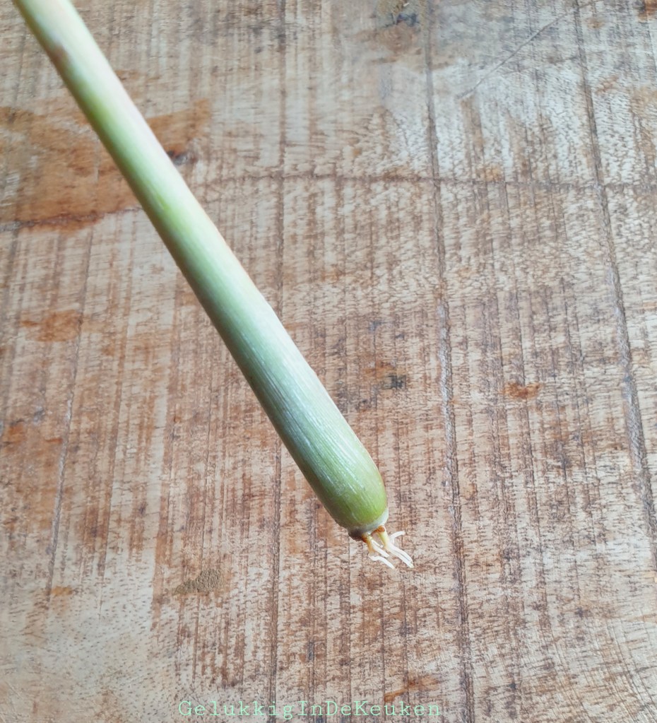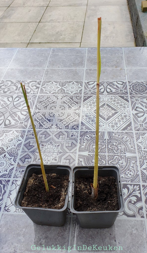 Twee citroengrassen hebben wortels gekregen, dus die heb ik ieder in een eigen potje met potgrond gedaan. Het is weer afwachten of het goed gaat. Naar mijn idee ziet de buitenlaag van de citroengras er droog uit. Ik heb een paar verdorde lagen al weggeknipt.