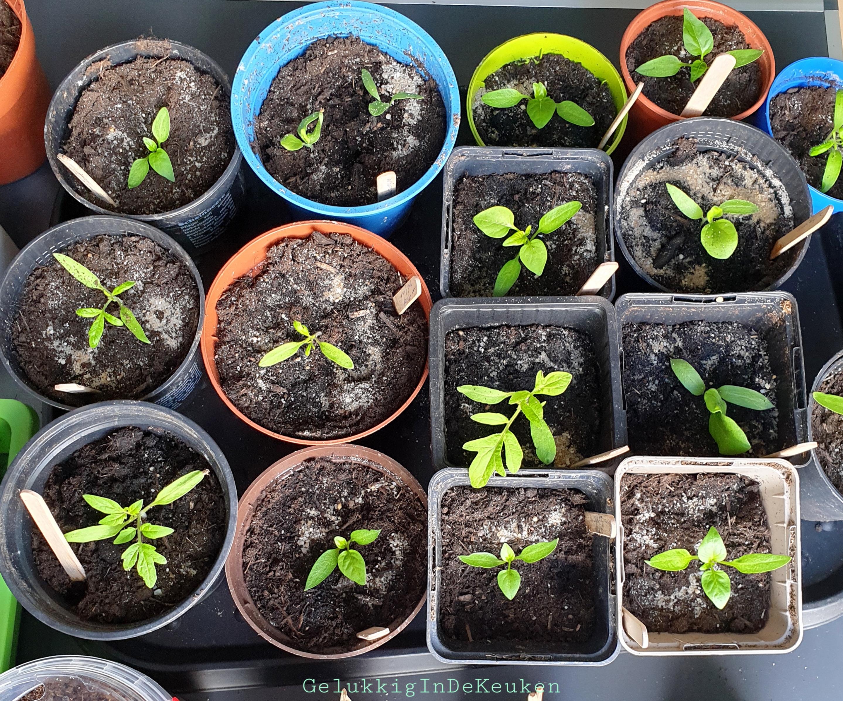 De verspeende zaailingen gaan goed. Nu ze in potgrond staan en daardoor voeding krijgen groeien ze hard. Om de paar dagen geef ik ze via de onderkant water.