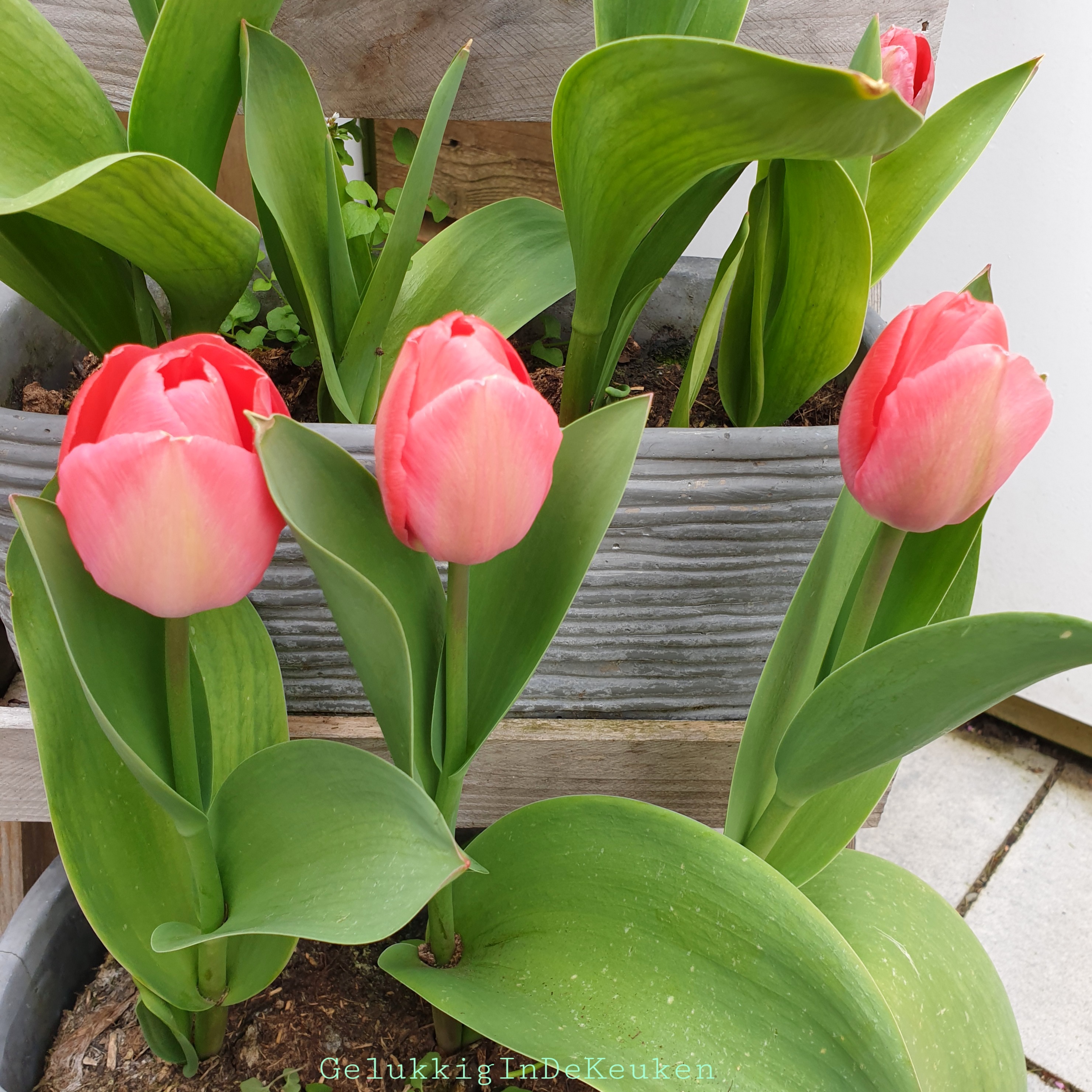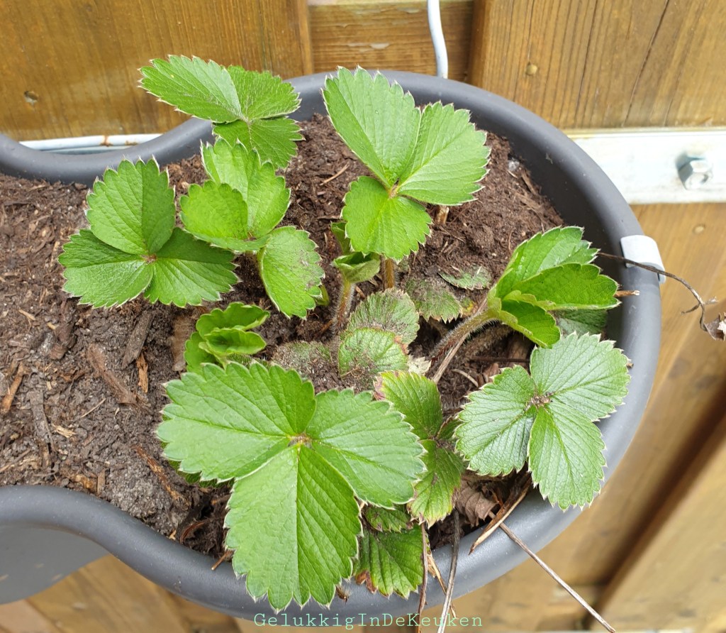 Tot slot heb ik nog aardbeien in hangbakken. De aardbeienplantjes hebben gelukkig de winter overleefd.