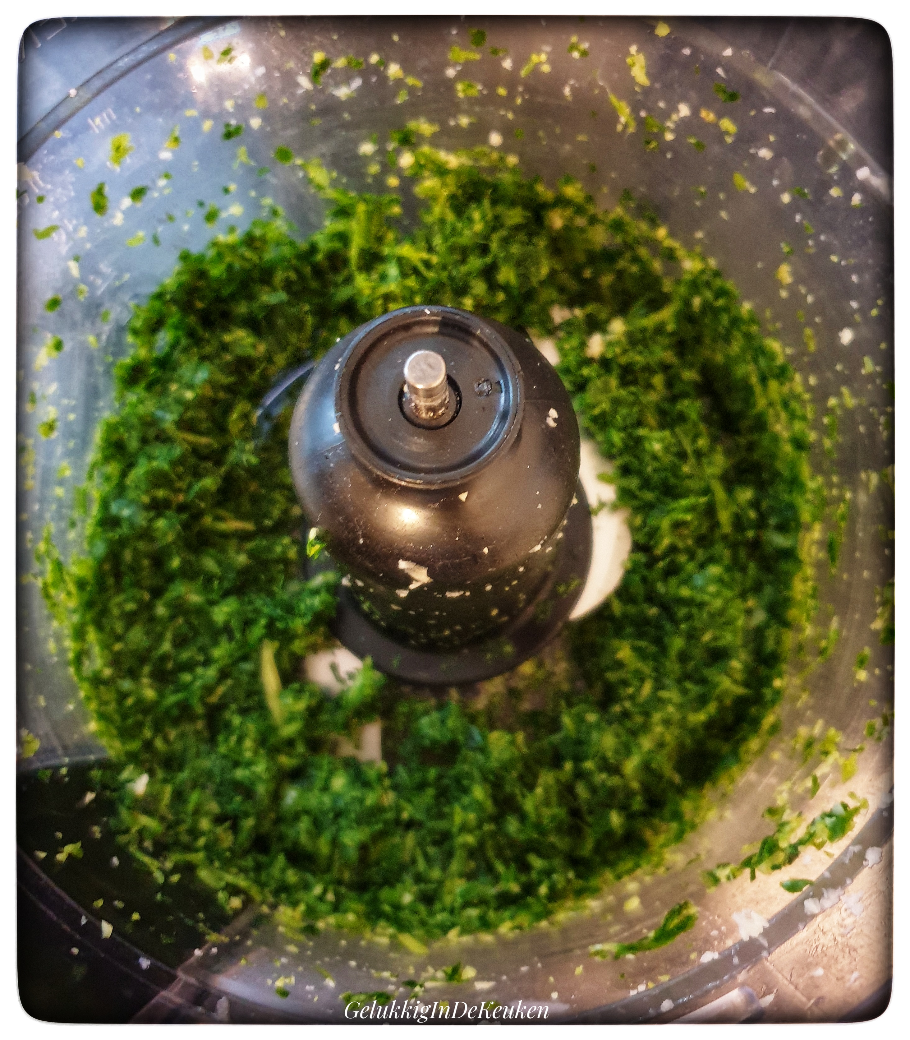 Je hoeft de keukenmachine niet schoon te maken. Breek de koriander en peterselie (ook de stengsels) in stukken en doe ze in de keukenmachine.