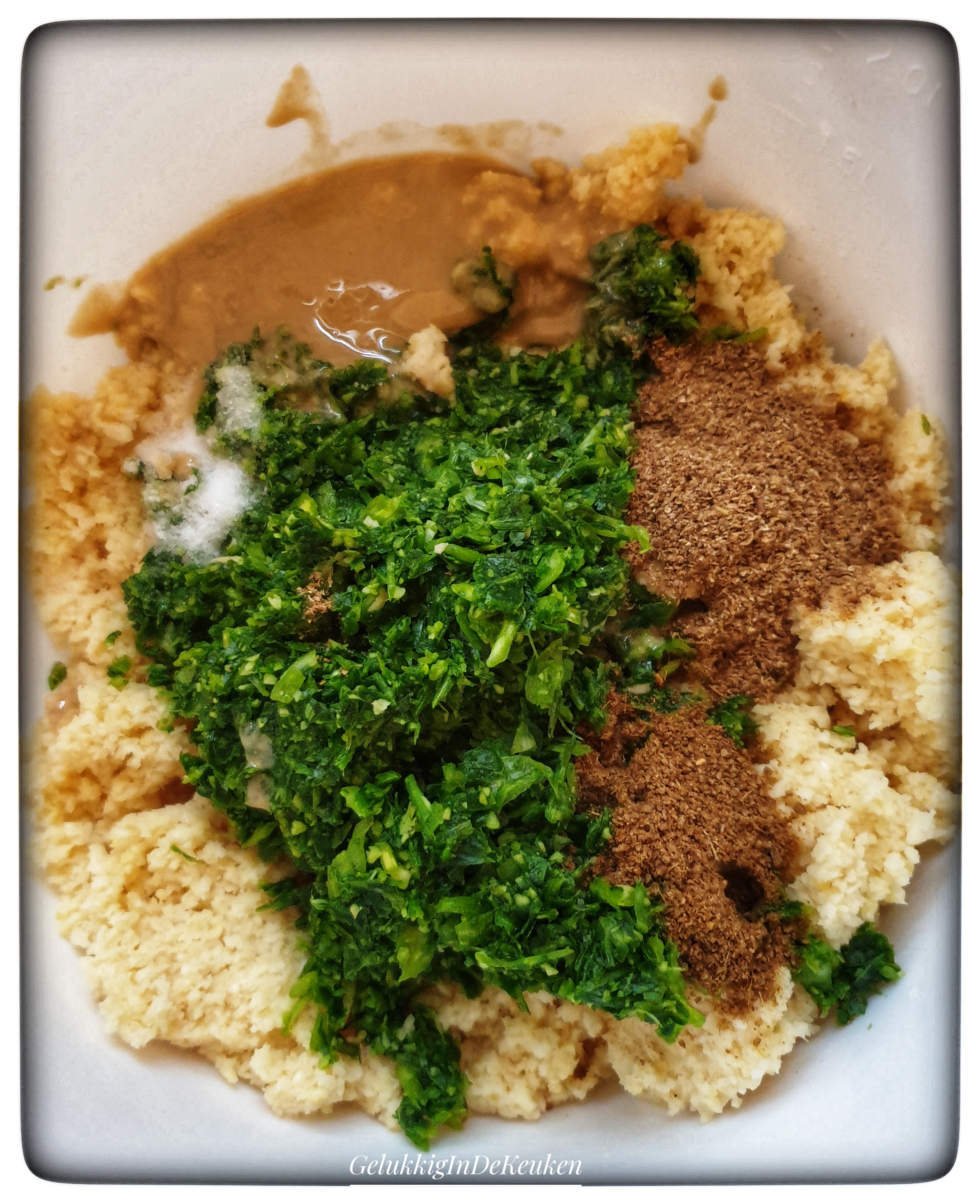 Voeg de specerijen, zout, baksoda en tahini toe en meng met je handen.
