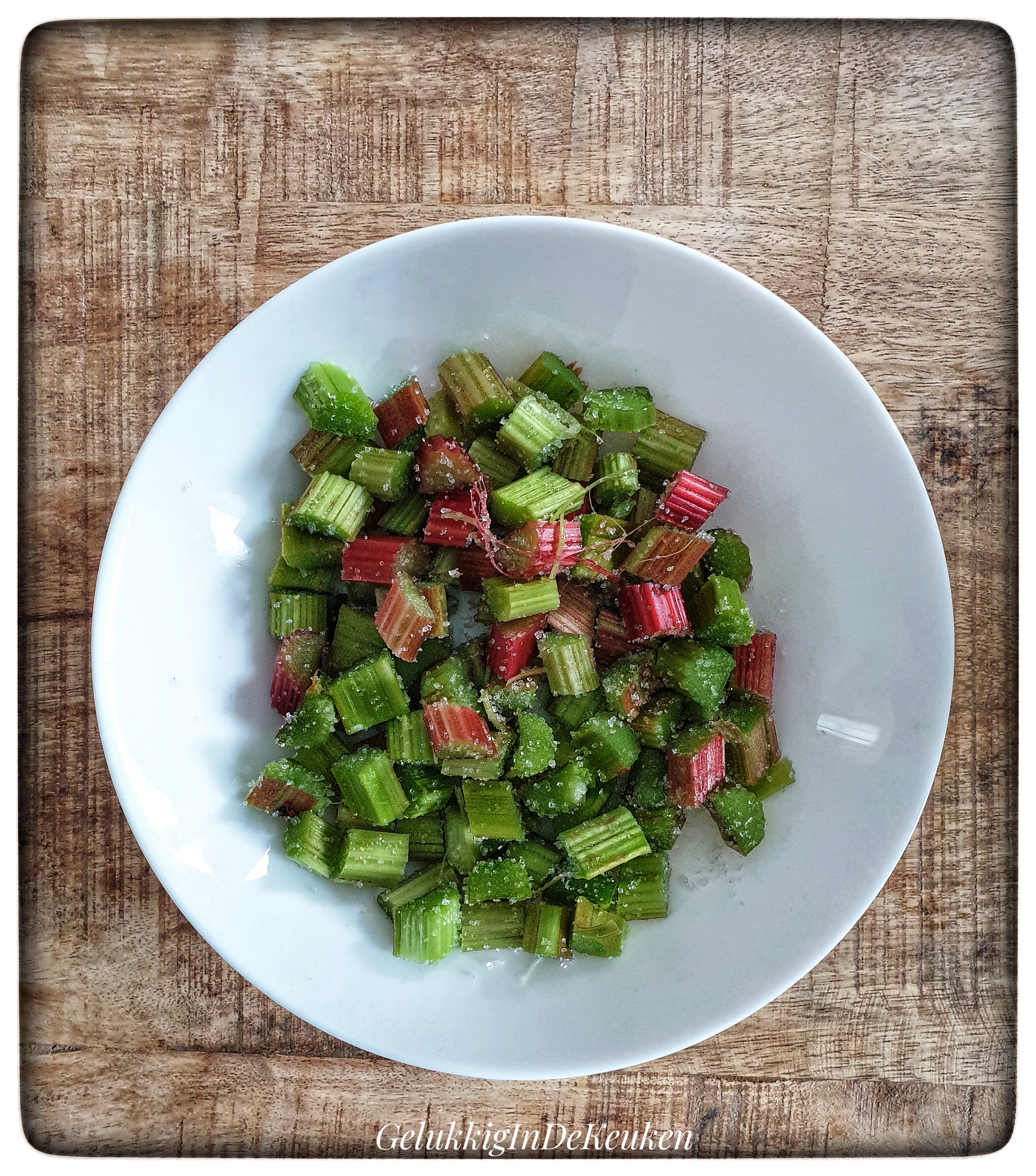 Snijd de rabarber in 1 cm stukjes en meng het met 1 eetlepel suiker. Laat het even staan.