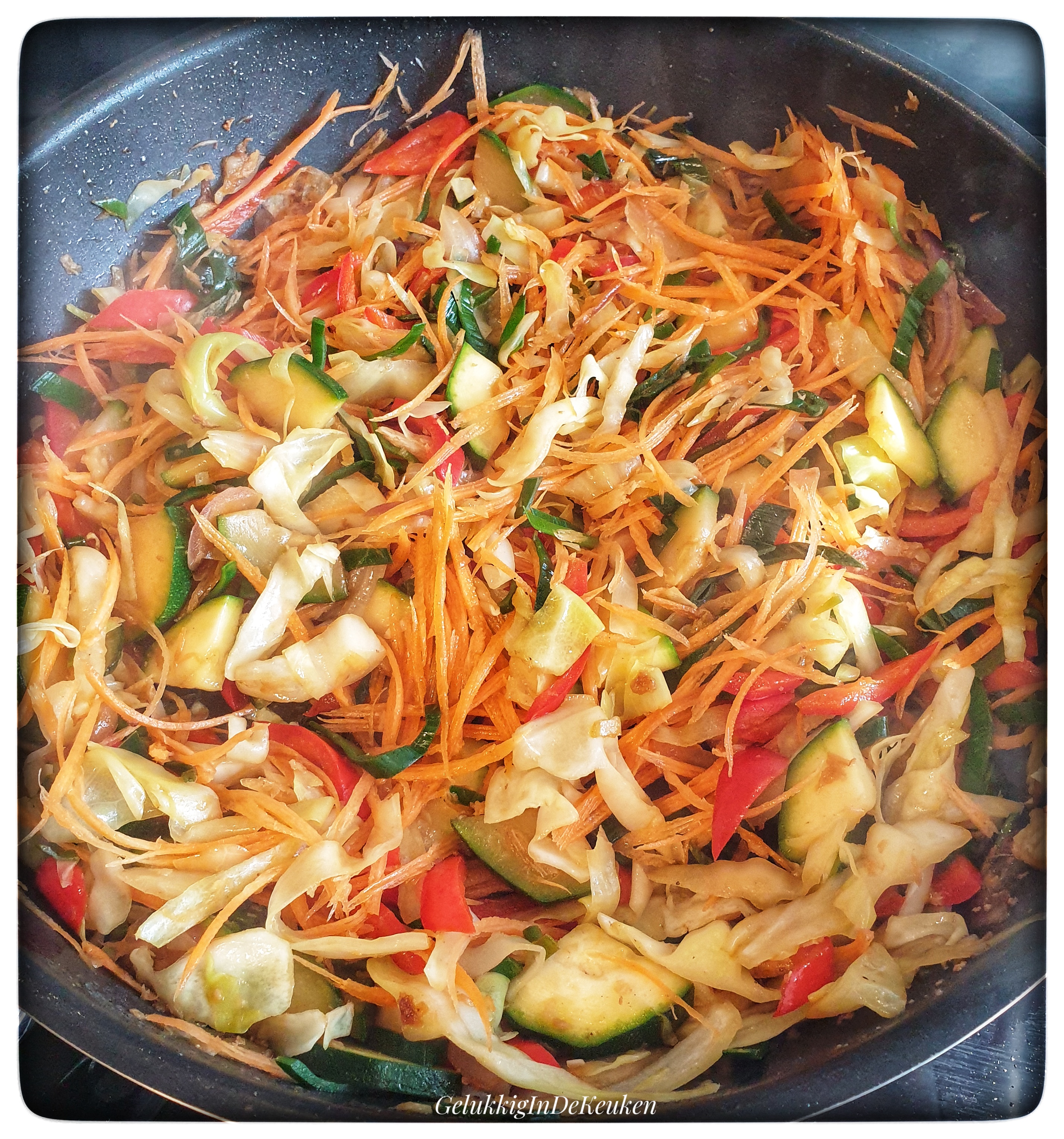 Kook terwijl de groenten bakken de noedels volgens de verpakking en giet vervolgens af. Spoel na met koud water, zodat het niet gaat plakken.