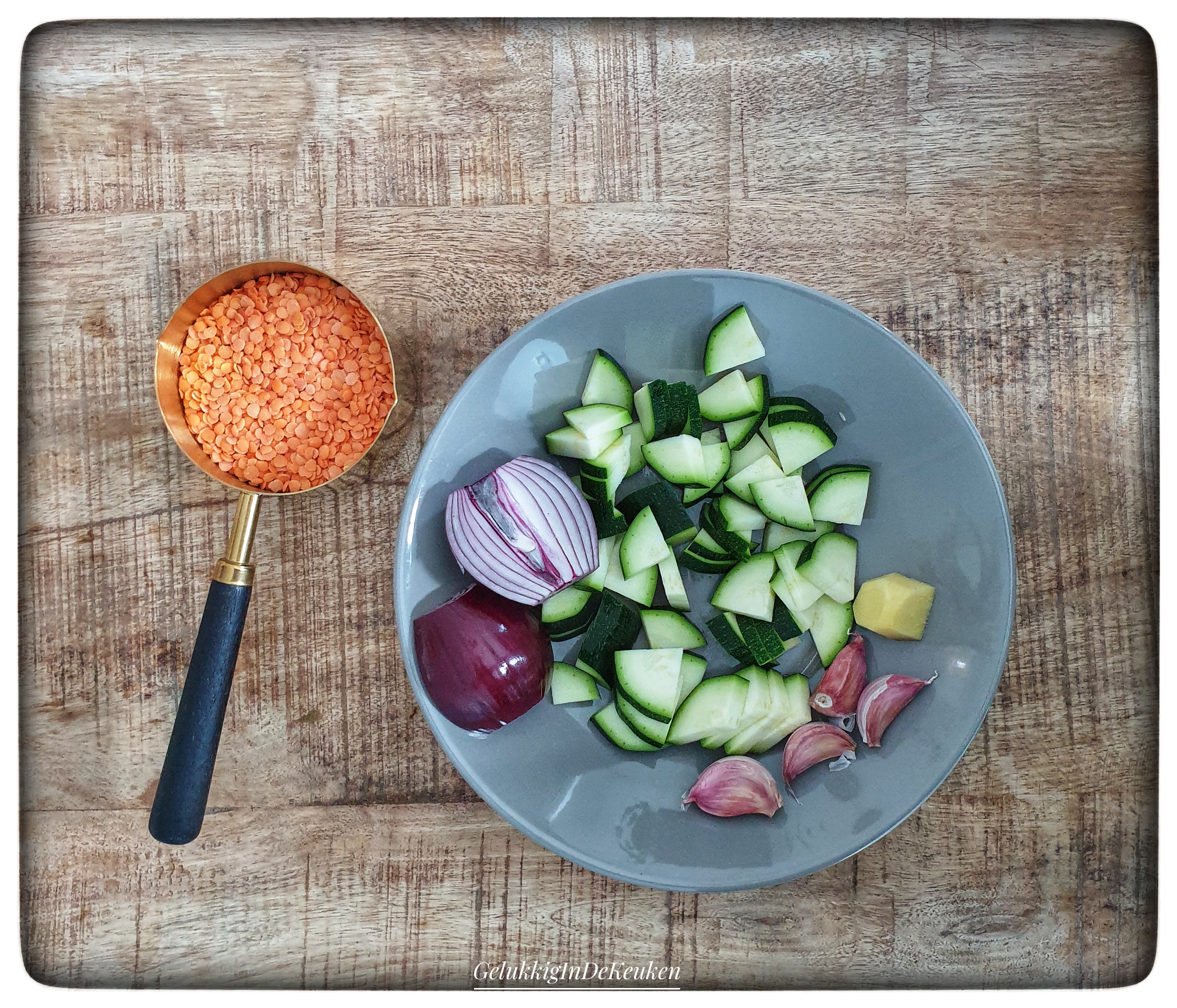 Een voedzame curry van rode linzen, babyspinazie, courgette en tomaten.