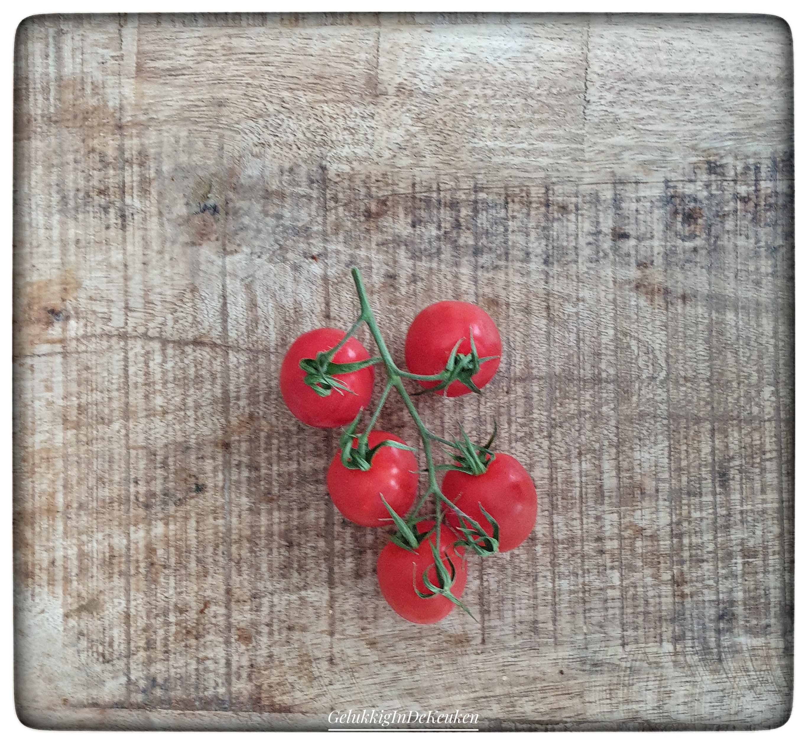 Verwarm in een diepe pan 1 tl olie op laag vuur en bak hierin de knoflook en gember. Voeg na een halve minuut de cherrytomaatjes en alle specerijen toe, roer goed door en laat het een minuut bakken.
