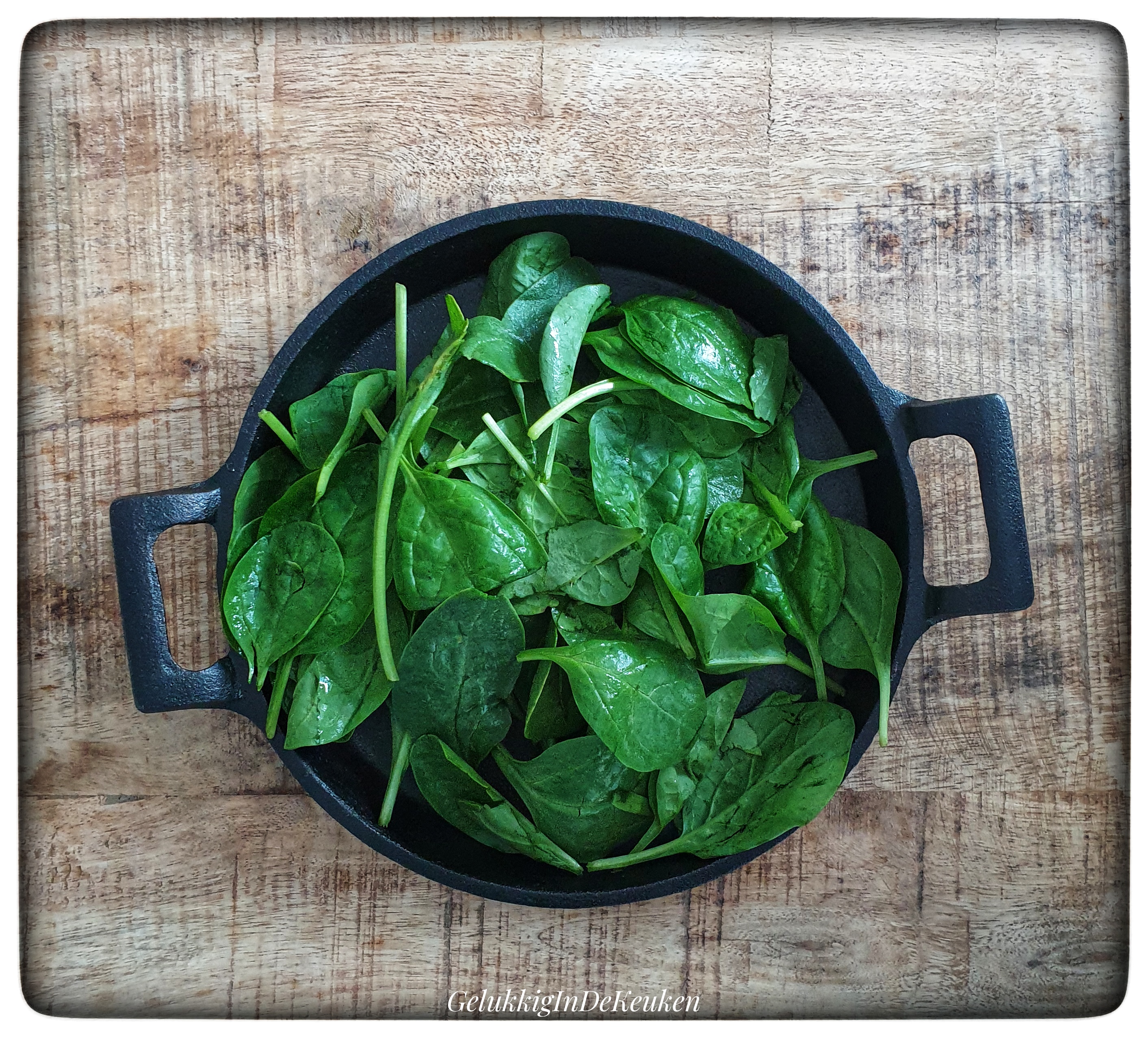 Als de linzen gaar zijn, het vuur uitzetten en de babyspinazie erdoor roeren.