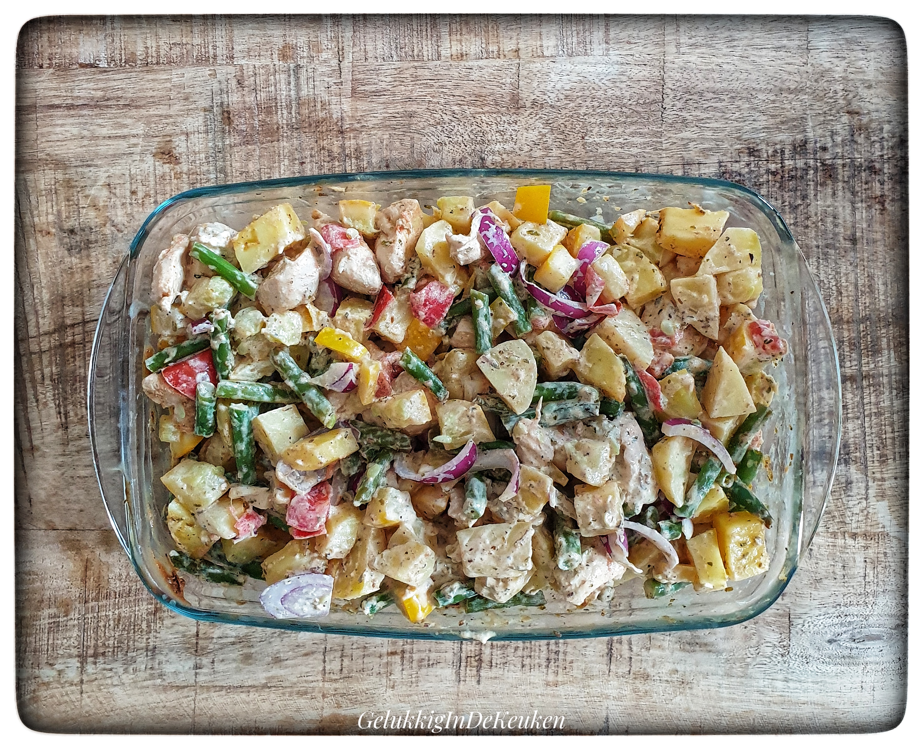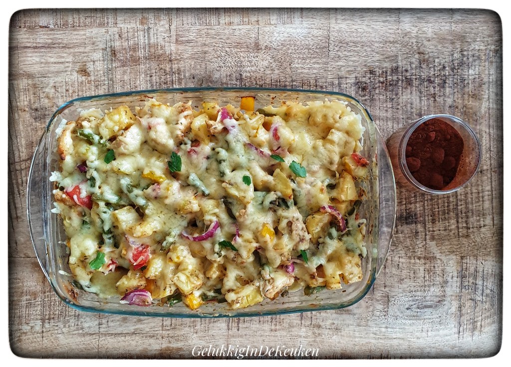 Een ovenschotel met aardappelen, kip en groenten. Je kan de ovenschotel ook vegetarisch maken. Voeg dan iets meer groenten toe.