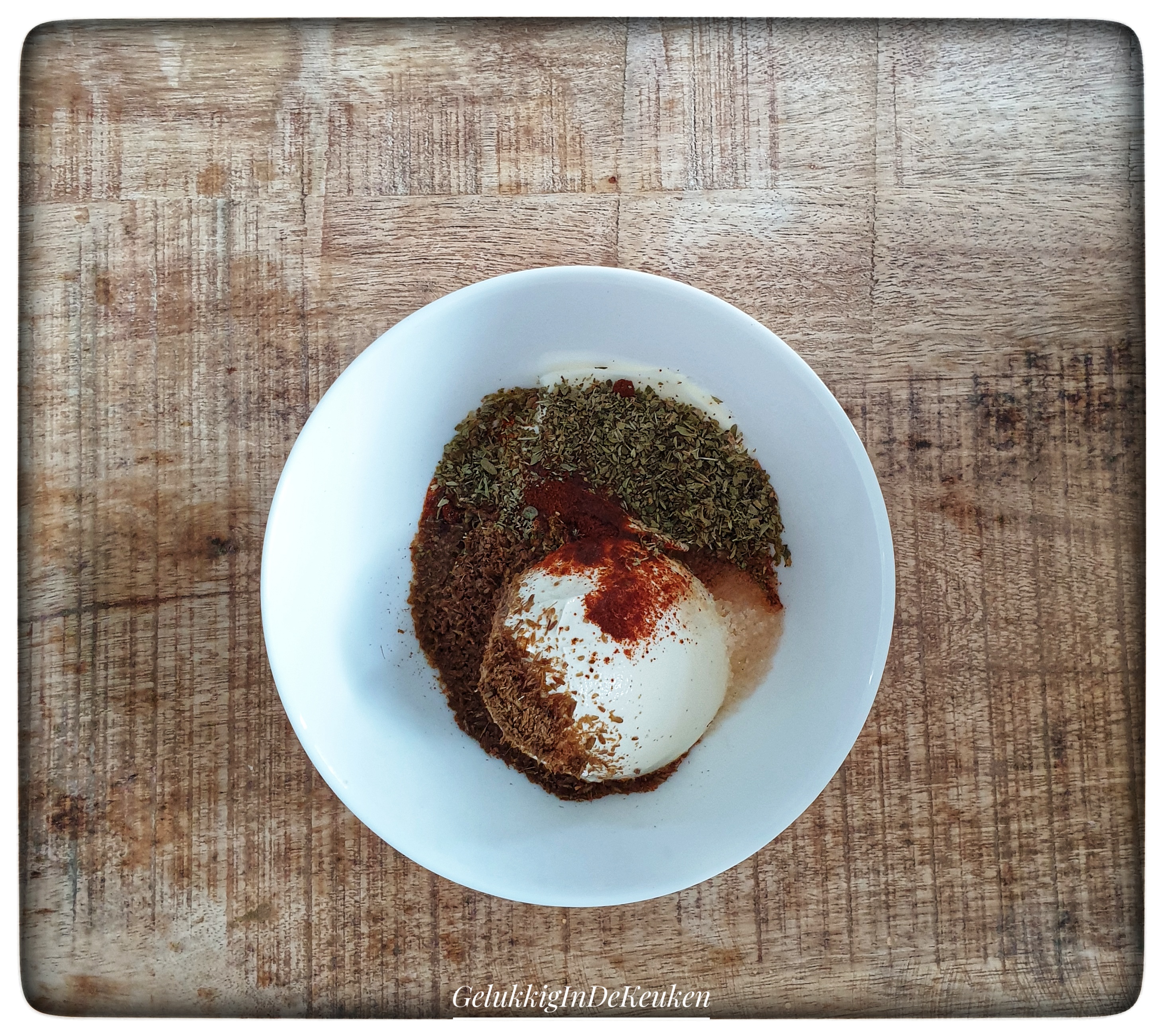 Maak de saus door de ingrediënten te mengen in een schaal.