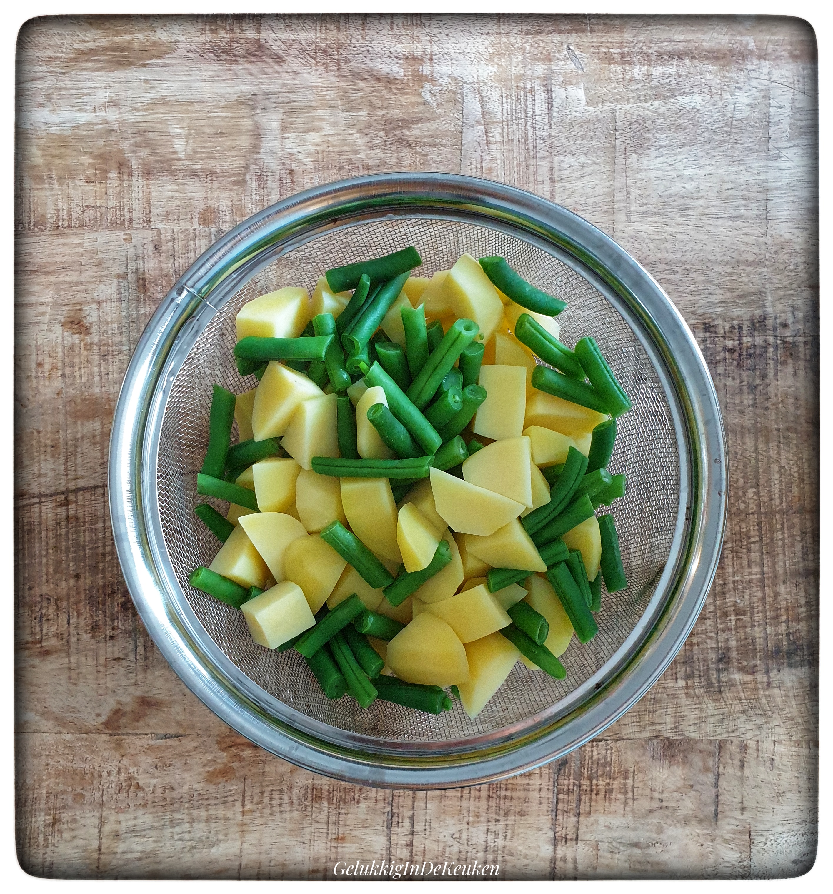 Snijd intussen de sperziebonen in 3 stukjes en voeg toe zodra de aardappelen koken. Kook de aardappelen en sperziebonen 3 minuten en giet daarna af.