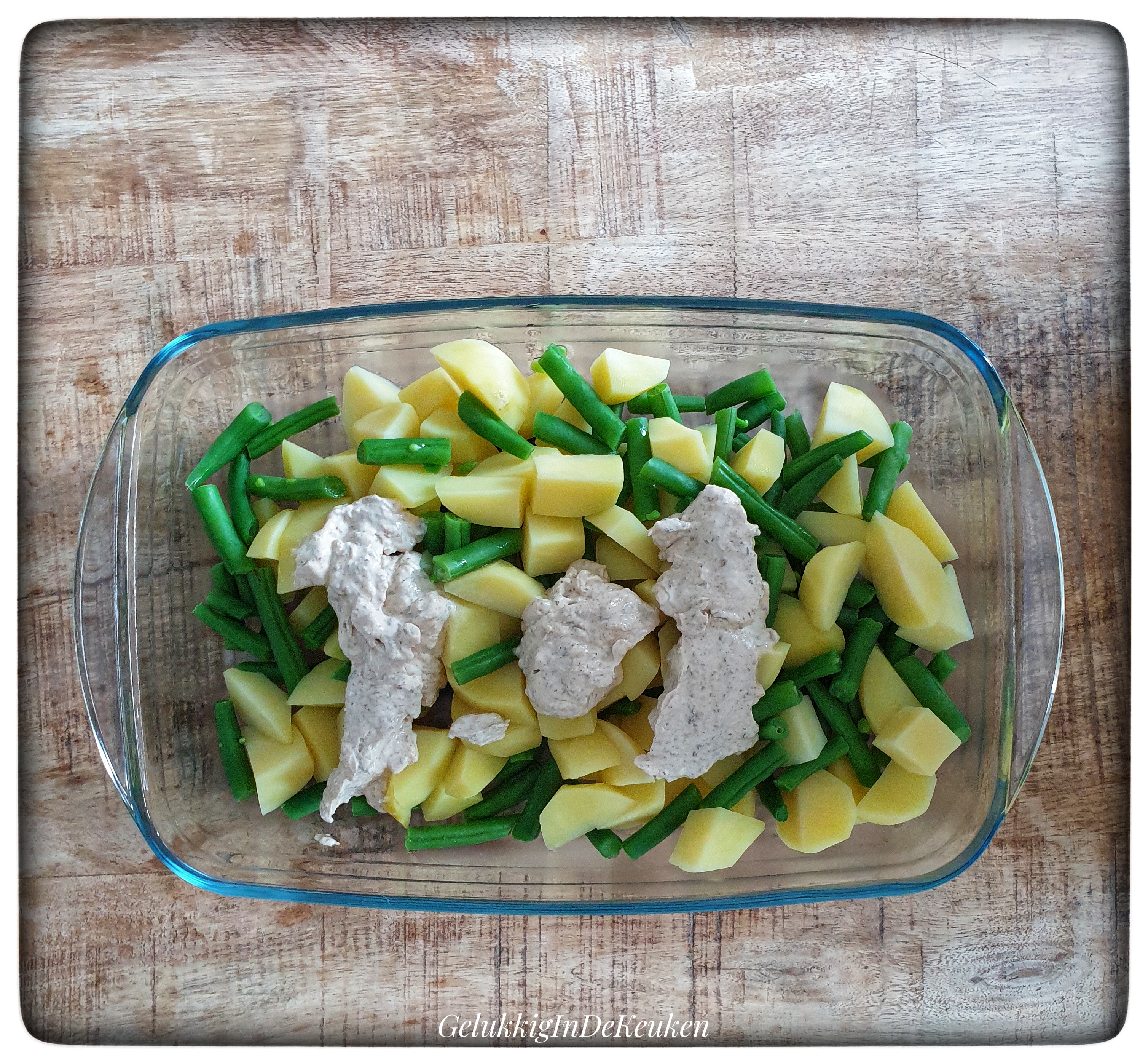 Doe de aardappelen en sperziebonen in een ovenschotel en meng het met 2/3 van de saus. Zet het in de oven voor 30 minuten.