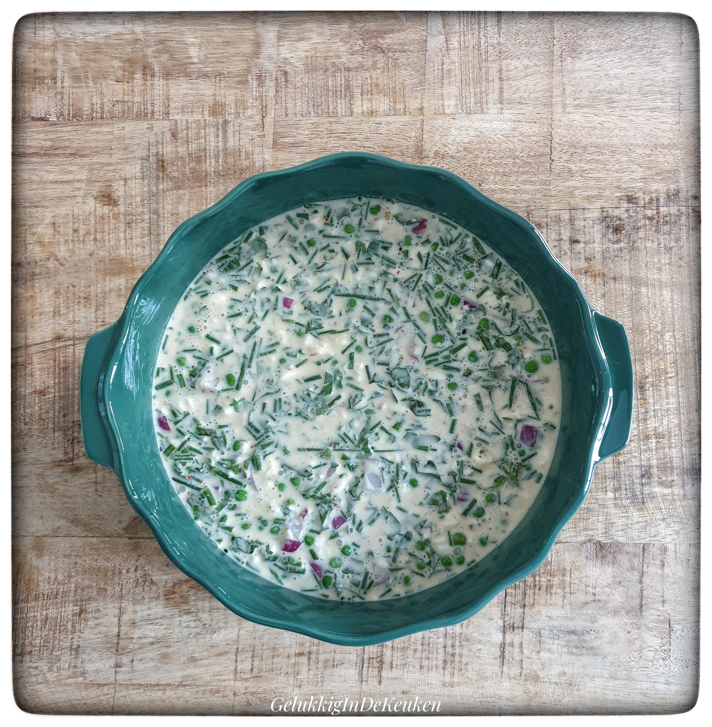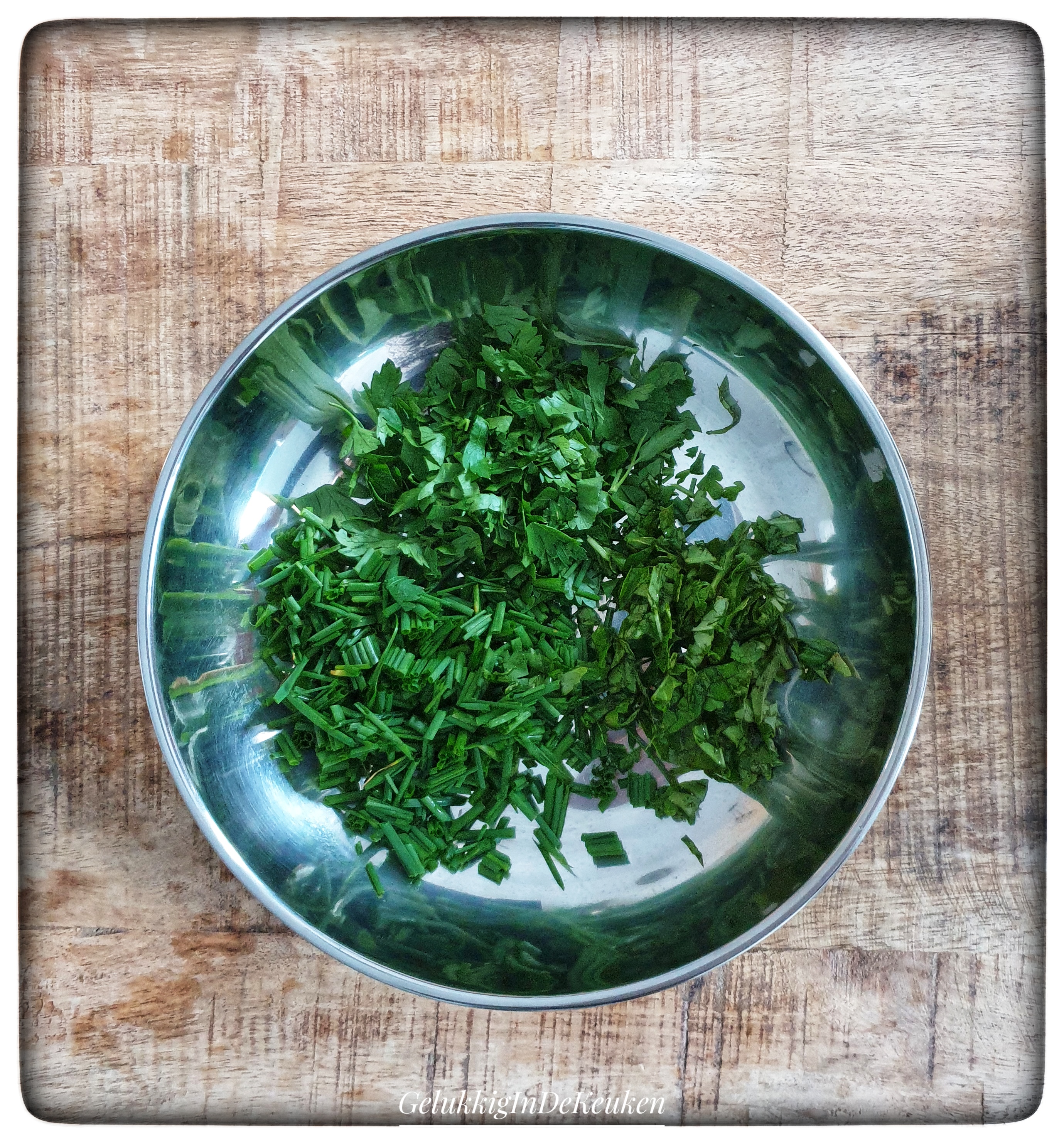 Snijd de ui, peterselie, bieslook en basilicum fijn.