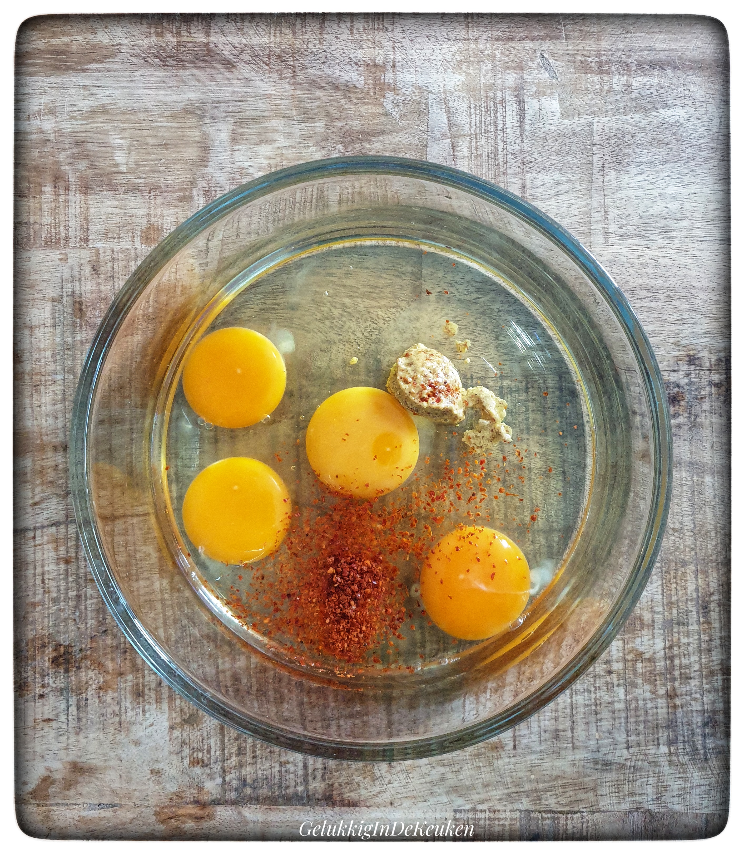 Doe de eieren, pul biber en mosterd in een kom en kluts het flink door.