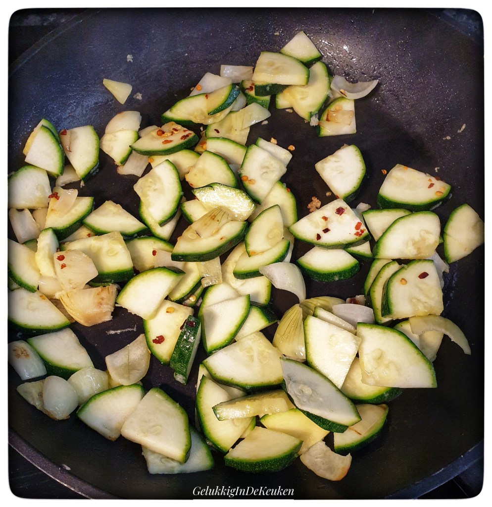 Verwarm in een koekenpan de olie op matig vuur en fruit de ui voor een paar minuten. Voeg de courgette en chilivlokken toe en bak tot de courgette gaar is.