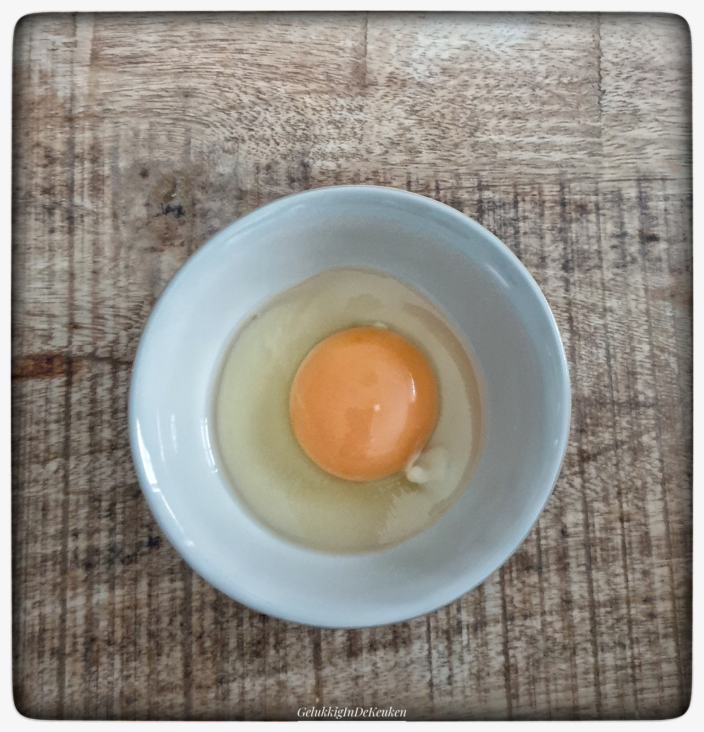 Breek intussen een ei open boven een zeefje, het vloeibare wat eruit is gelopen mag weg. En doe de ei vervolgens in een klein schaaltje.