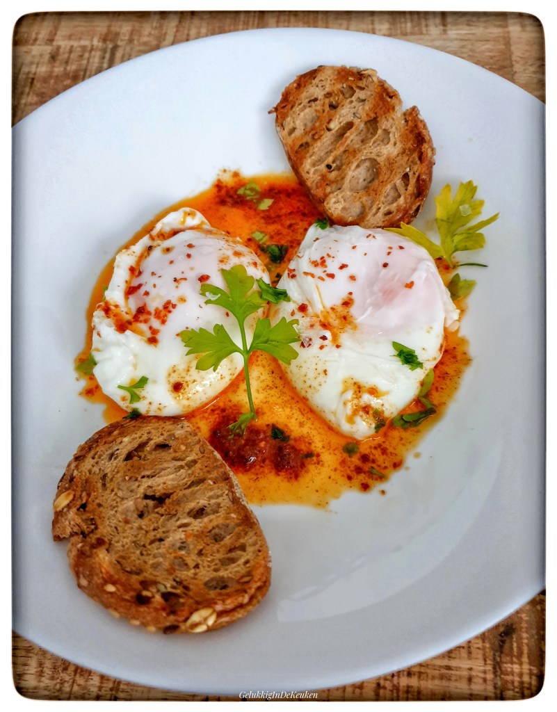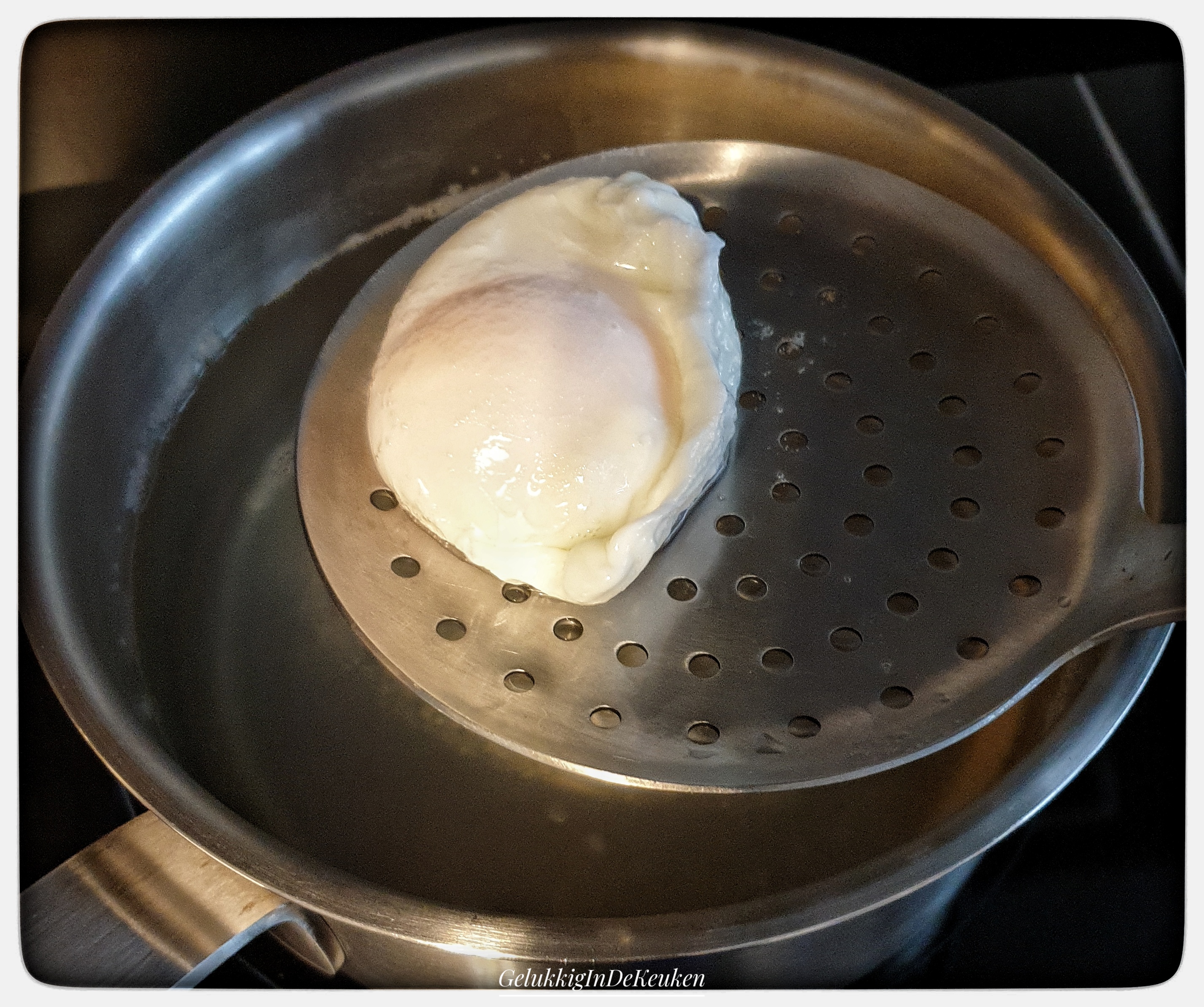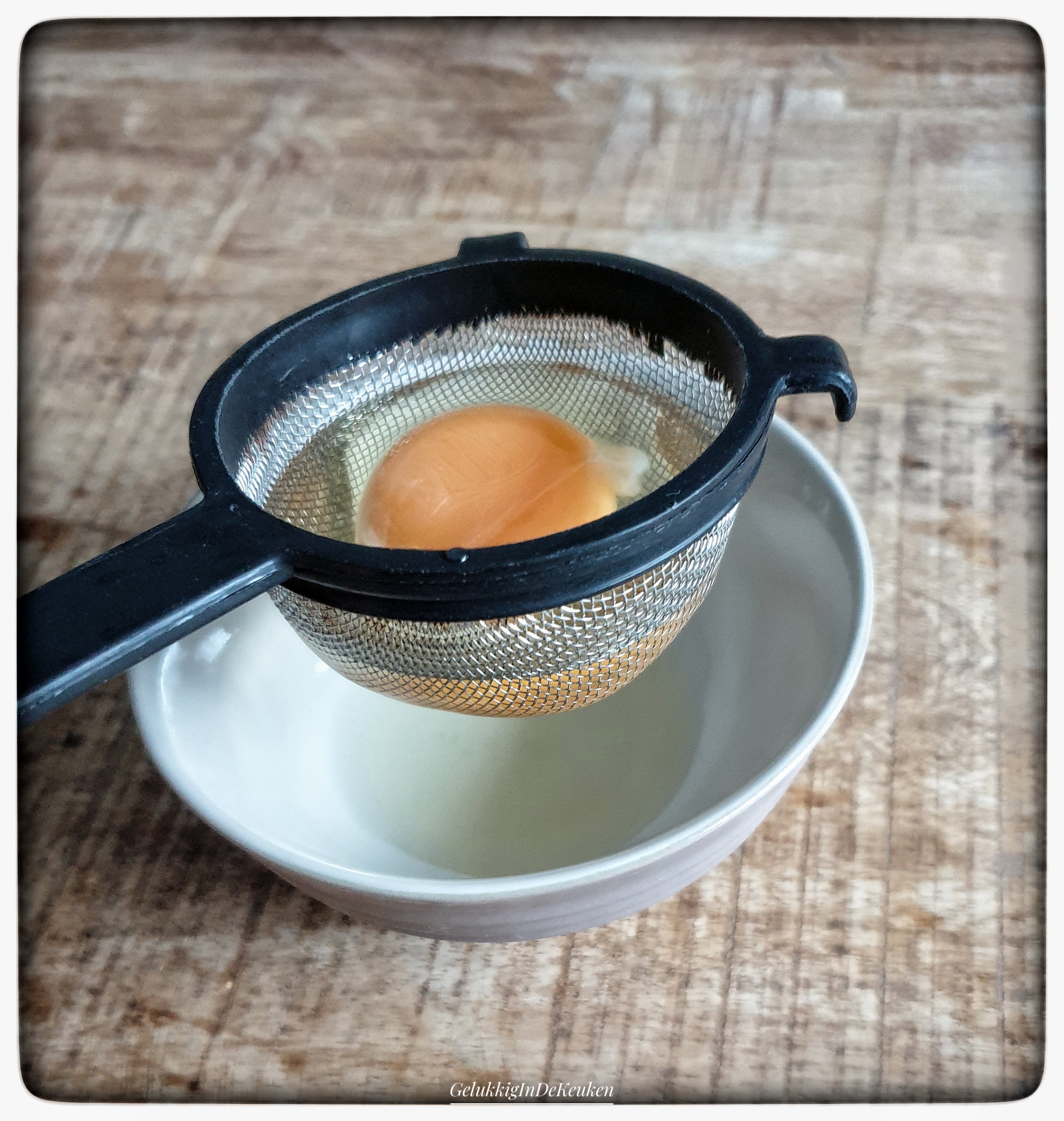 Ik heb ooit ergens een tip gezien om de ei eerst te breken boven een fijne zeef, zodat het hele vloeibare eruit kan. Hierdoor gaat je ei straks mooi pocheren. Ik sla deze stap nooit meer over.